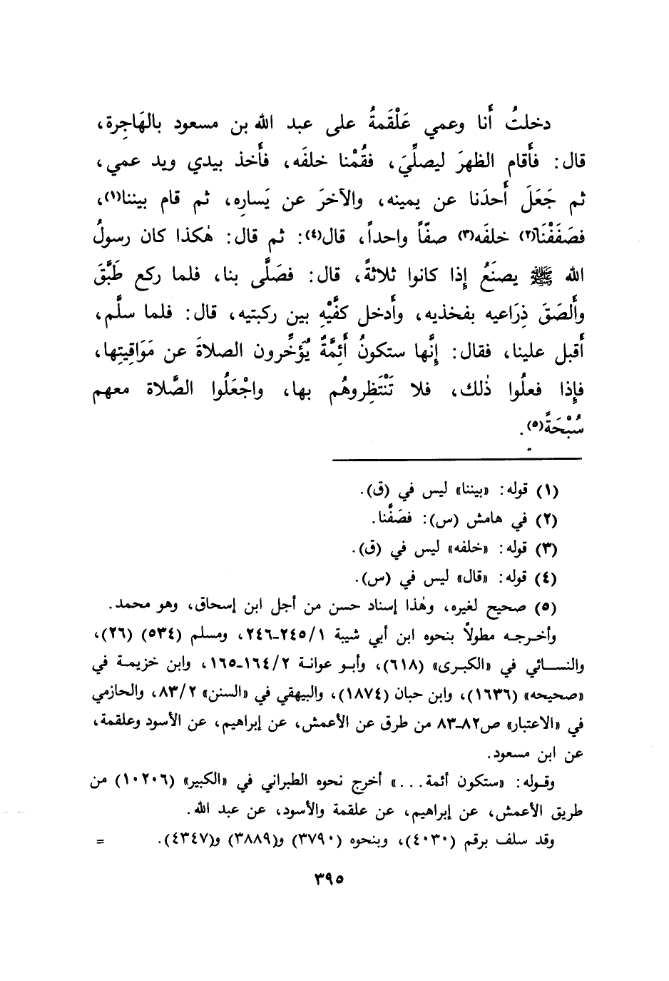 دَخَلْتُ أَنَا وَعَمِّي عَلْقَمَةُ عَلَى عَبْدِ اللهِ بْنِ مَسْعُودٍ بِالْهَاجِرَةِ قَالَ: " فَأَقَامَ الظُّهْرَ لِيُصَلِّيَ فَقُمْنَا خَلْفَهُ، فَأَخَذَ بِيَدِي، وَيَدِ عَمِّي، ثُمَّ جَعَلَ أَحَدَنَا عَنْ يَمِينِهِ، وَالْآخَرَ، عَنْ يَسَارِهِ، ثُمَّ قَامَ بَيْنَنَا (١) فَصَفَفْنَا (٢) خَلْفَهُ (٣) صَفًّا وَاحِدًا "، قَالَ: قَالَ (٤) ثُمَّ: قَالَ: " هَكَذَا كَانَ رَسُولُ اللهِ صَلَّى اللهُ عَلَيْهِ وَسَلَّمَ، يَصْنَعُ إِذَا كَانُوا ثَلَاثَةً "، قَالَ: فَصَلَّى بِنَا فَلَمَّا رَكَعَ طَبَّقَ، وَأَلْصَقَ ذِرَاعَيْهِ بِفَخِذَيْهِ، وَأَدْخَلَ كَفَّيْهِ بَيْنَ رُكْبَتَيْهِ، قَالَ: فَلَمَّا سَلَّمَ أَقْبَلَ عَلَيْنَا، فَقَالَ: إِنَّهَا سَتَكُونُ أَئِمَّةٌ يُؤَخِّرُونَ الصَّلَاةَ عَنْ مَوَاقِيتِهَا فَإِذَا فَعَلُوا ذَلِكَ فَلَا تَنْتَظِرُوهُمْ بِهَا، وَاجْعَلُوا الصَّلَاةَ مَعَهُمْ سُبْحَةً (٥)