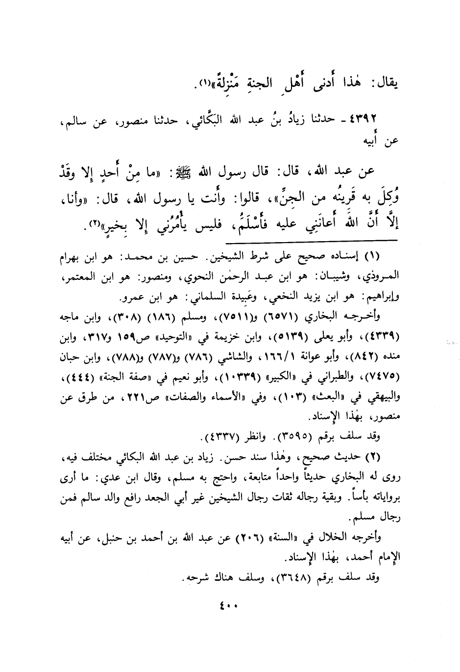 ٤٣٩٢ - حَدَّثَنَا زِيَادُ بْنُ عَبْدِ اللهِ الْبَكَّائِيُّ، حَدَّثَنَا مَنْصُورٌ، عَنْ سَالِمٍ، عَنْ أَبِيهِ، عَنْ عَبْدِ اللهِ، قَالَ: قَالَ رَسُولُ اللهِ صَلَّى اللهُ عَلَيْهِ وَسَلَّمَ: " مَا مِنْ أَحَدٍ إِلَّا وَقَدْ، وُكِّلَ بِهِ قَرِينُهُ مِنَ الْجِنِّ "، قَالُوا: وَأَنْتَ يَا رَسُولَ اللهِ؟، قَالَ: " وَأَنَا إِلَّا أَنَّ اللهَ أَعَانَنِي عَلَيْهِ فَأَسْلَمَ فَلَيْسَ يَأْمُرُنِي إِلَّا بِخَيْرٍ " (٢)