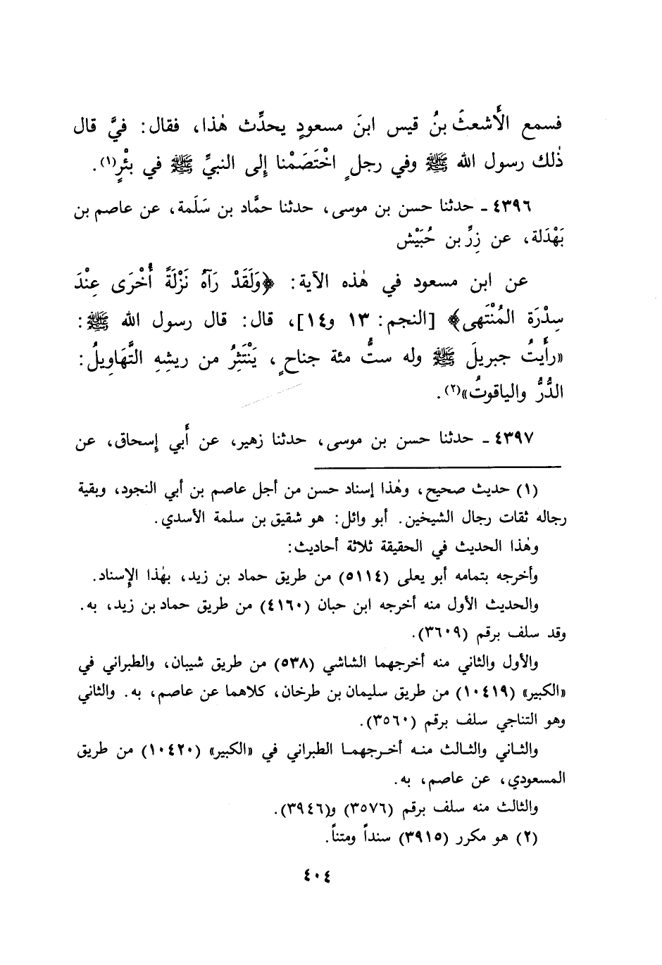 ٤٣٩٦ - حَدَّثَنَا حَسَنُ بْنُ مُوسَى، حَدَّثَنَا حَمَّادُ بْنُ سَلَمَةَ، عَنْ عَاصِمٍ ابْنِ بَهْدَلَةَ، عَنْ زِرِّ بْنِ حُبَيْشٍ، عَنْ ابْنِ مَسْعُودٍ، فِي هَذِهِ الْآيَةِ: {وَلَقَدْ رَآهُ نَزْلَةً أُخْرَى عِنْدَ سِدْرَةِ الْمُنْتَهَى} [النجم: ١٤] ، قَالَ: قَالَ رَسُولُ اللهِ صَلَّى اللهُ عَلَيْهِ وَسَلَّمَ: " رَأَيْتُ جِبْرِيلَ صَلَّى اللهُ عَلَيْهِ وَسَلَّمَ وَلَهُ سِتُّ مِائَةِ جَنَاحٍ، يَنْتَثِرُ مِنْ رِيشِهِ التَّهَاوِيلُ: الدُّرُّ، وَالْيَاقُوتُ " (٢)