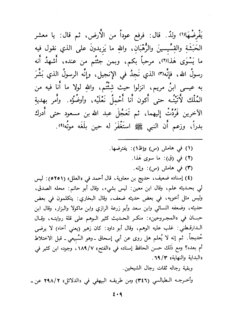 يَفْرِضْهَا (١) وَلَدٌ، قَالَ: فَرَفَعَ عُودًا مِنَ الْأَرْضِ، ثُمَّ قَالَ: يَا مَعْشَرَ الْحَبَشَةِ، وَالْقِسِّيسِينَ، وَالرُّهْبَانِ، َاللهِ مَا يَزِيدُونَ عَلَى الَّذِي نَقُولُ فِيهِ مَا يَسْوَى هَذَا، (٢) مَرْحَبًا بِكُمْ، وَبِمَنْ جِئْتُمْ مِنْ عِنْدِهِ، أَشْهَدُ أَنَّهُ رَسُولُ اللهِ، فَإِنَّهُ (٣) الَّذِي نَجِدُ فِي الْإِنْجِيلِ، وَإِنَّهُ الرَّسُولُ الَّذِي بَشَّرَ بِهِ عِيسَى ابْنُ مَرْيَمَ، انْزِلُوا حَيْثُ شِئْتُمْ، وَاللهِ لَوْلَا مَا أَنَا فِيهِ مِنَ الْمُلْكِ لَأَتَيْتُهُ حَتَّى أَكُونَ أَنَا أَحْمِلُ نَعْلَيْهِ، وَأُوَضِّئُهُ، وَأَمَرَ بِهَدِيَّةِ الْآخَرِينَ فَرُدَّتْ إِلَيْهِمَا، ثُمَّ تَعَجَّلَ عَبْدُ اللهِ بْنُ مَسْعُودٍ حَتَّى أَدْرَكَ بَدْرًا، وَزَعَمَ أَنَّ: النَّبِيَّ صَلَّى اللهُ عَلَيْهِ وَسَلَّمَ، اسْتَغْفَرَ لَهُ حِينَ بَلَغَهُ مَوْتُهُ (٤)
