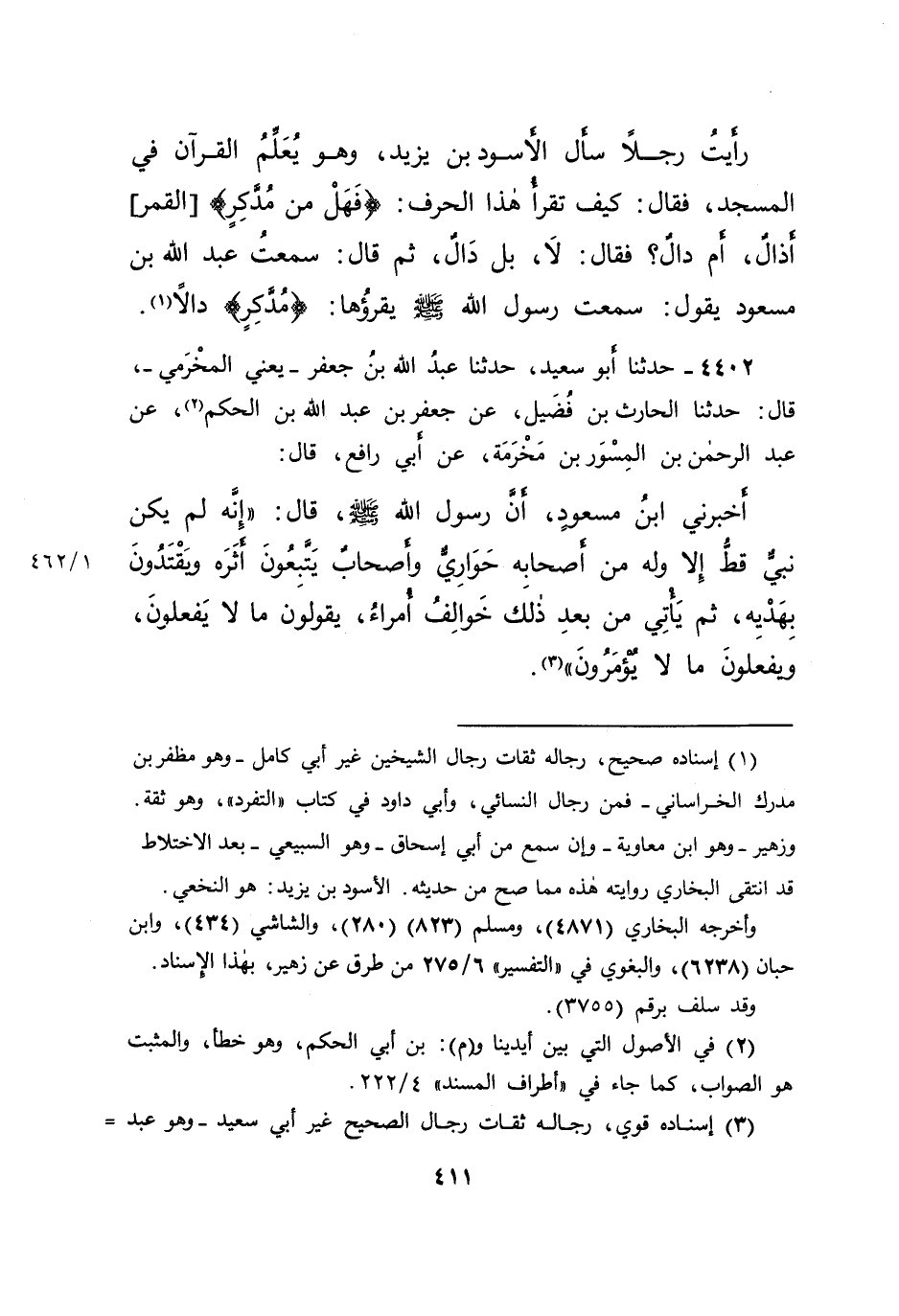 رَأَيْتُ رَجُلًا سَأَلَ الْأَسْوَدَ بْنَ يَزِيدَ، وَهُوَ يُعَلِّمُ الْقُرْآنَ فِي الْمَسْجِدِ، فَقَالَ: كَيْفَ تَقْرَأُ هَذَا الْحَرْفَ {فَهَلْ مِنْ مُدَّكِرٍ} [القمر: ١٥] أَذَالٌ، أَمْ دَالٌ؟ فَقَالَ: لَا، بَلْ دَالٌ، ثُمَّ قَالَ: سَمِعْتُ عَبْدَ اللهِ بْنَ مَسْعُودٍ يَقُولُ: سَمِعْتُ رَسُولَ اللهِ صَلَّى اللهُ عَلَيْهِ وَسَلَّمَ: " يَقْرَؤُهَا: {مُدَّكِرٍ} [القمر: ١٥] دَالًا " (١)