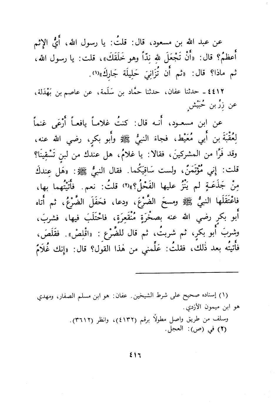 ٤٤١٢ - حَدَّثَنَا عَفَّانُ، حَدَّثَنَا حَمَّادُ بْنُ سَلَمَةَ، عَنْ عَاصِمٍ ابْنِ بَهْدَلَةَ، عَنْ زِرِّ بْنِ حُبَيْشٍ، عَنْ ابْنِ مَسْعُودٍ، أَنَّهُ قَالَ: كُنْتُ غُلَامًا يَافِعًا أَرْعَى غَنَمًا لِعُقْبَةَ بْنِ أَبِي مُعَيْطٍ، فَجَاءَ النَّبِيُّ صَلَّى اللهُ عَلَيْهِ وَسَلَّمَ، وَأَبُو بَكْرٍ رَضِيَ اللهُ عَنْهُ، وَقَدْ فَرَّا مِنَ الْمُشْرِكِينَ، فَقَالَا: " يَا غُلَامُ، هَلْ عِنْدَكَ مِنْ لَبَنٍ تَسْقِينَا؟ "، قُلْتُ: إِنِّي مُؤْتَمَنٌ، وَلَسْتُ سَاقِيَكُمَا، فَقَالَ النَّبِيُّ صَلَّى اللهُ عَلَيْهِ وَسَلَّمَ: " هَلْ عِنْدَكَ مِنْ جَذَعَةٍ لَمْ يَنْزُ عَلَيْهَا الْفَحْلُ؟ " (٢) قُلْتُ: نَعَمْ، فَأَتَيْتُهُمَا بِهَا، فَاعْتَقَلَهَا النَّبِيُّ صَلَّى اللهُ عَلَيْهِ وَسَلَّمَ وَمَسَحَ الضَّرْعَ، وَدَعَا، فَحَفَلَ الضَّرْعُ، ثُمَّ أَتَاهُ أَبُو بَكْرٍ رَضِيَ اللهُ عَنْهُ بِصَخْرَةٍ مُنْقَعِرَةٍ، فَاحْتَلَبَ فِيهَا، فَشَرِبَ، وَشَرِبَ أَبُو بَكْرٍ، ثُمَّ شَرِبْتُ، ثُمَّ قَالَ لِلضَّرْعِ: " اقْلِصْ " فَقَلَصَ، فَأَتَيْتُهُ بَعْدَ ذَلِكَ، فَقُلْتُ: عَلِّمْنِي مِنْ هَذَا الْقَوْلِ؟ قَالَ: " إِنَّكَ غُلَامٌ