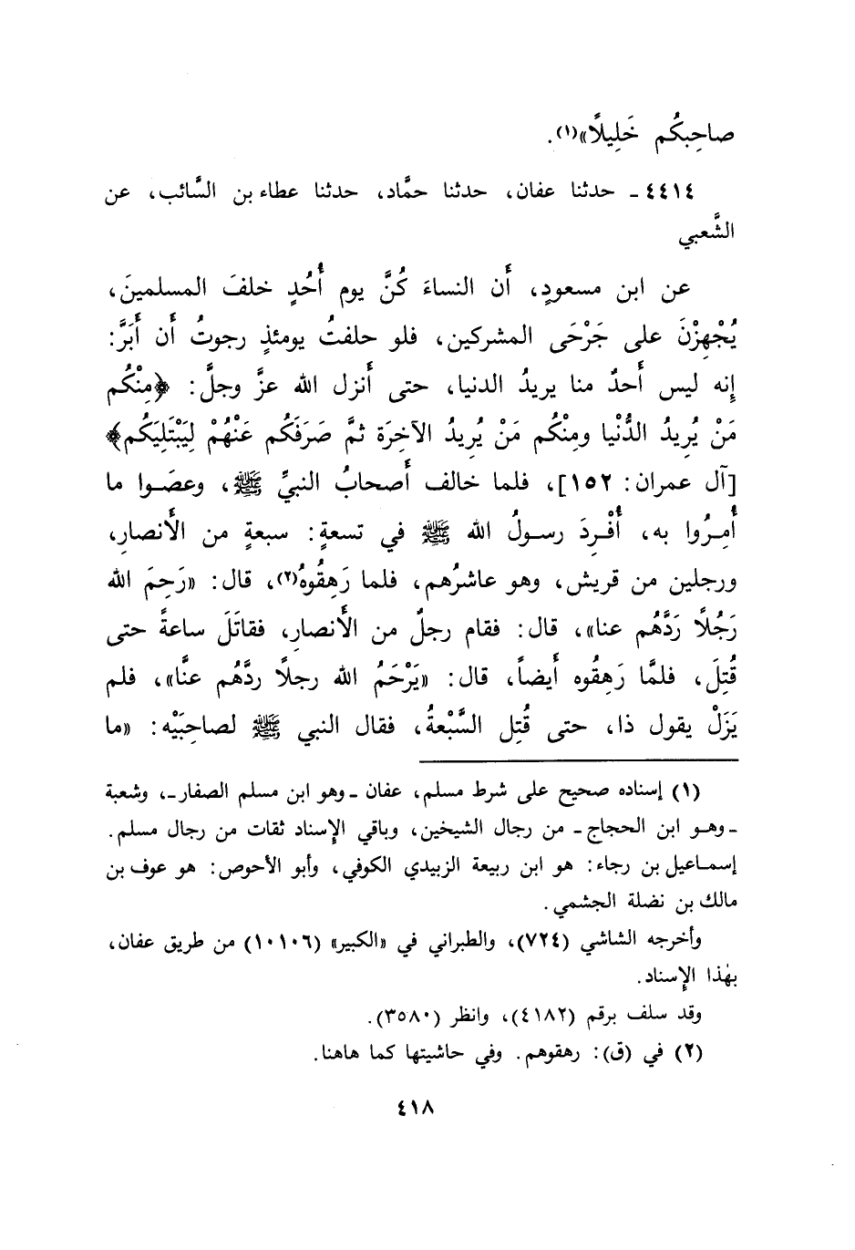 ٤٤١٤ - حَدَّثَنَا عَفَّانُ، حَدَّثَنَا حَمَّادٌ، حَدَّثَنَا عَطَاءُ بْنُ السَّائِبِ، عَنِ الشَّعْبِيِّ، عَنِ ابْنِ مَسْعُودٍ، أَنَّ النِّسَاءَ كُنَّ يَوْمَ أُحُدٍ خَلْفَ الْمُسْلِمِينَ، يُجْهِزْنَ عَلَى جَرْحَى الْمُشْرِكِينَ، فَلَوْ حَلَفْتُ يَوْمَئِذٍ رَجَوْتُ أَنْ أَبَرَّ: إِنَّهُ لَيْسَ أَحَدٌ مِنَّا يُرِيدُ الدُّنْيَا، حَتَّى أَنْزَلَ اللهُ عَزَّ وَجَلَّ: {مِنْكُمْ مَنْ يُرِيدُ الدُّنْيَا وَمِنْكُمْ مَنْ يُرِيدُ الْآخِرَةَ، ثُمَّ صَرَفَكُمْ عَنْهُمْ لِيَبْتَلِيَكُمْ} [آل عمران: ١٥٢] فَلَمَّا خَالَفَ أَصْحَابُ النَّبِيِّ صَلَّى اللهُ عَلَيْهِ وَسَلَّمَ، وَعَصَوْا مَا أُمِرُوا بِهِ، أُفْرِدَ رَسُولُ اللهِ صَلَّى اللهُ عَلَيْهِ وَسَلَّمَ فِي تِسْعَةٍ: سَبْعَةٍ مِنَ الْأَنْصَارِ، وَرَجُلَيْنِ مِنْ قُرَيْشٍ وَهُوَ عَاشِرُهُمْ، فَلَمَّا رَهِقُوهُ، قَالَ: " رَحِمَ اللهُ رَجُلًا رَدَّهُمْ عَنَّا "، قَالَ: فَقَامَ رَجُلٌ مِنَ الْأَنْصَارِ، فَقَاتَلَ سَاعَةً حَتَّى قُتِلَ، فَلَمَّا رَهِقُوهُ (٢) أَيْضًا، قَالَ: " يَرْحَمُ اللهُ رَجُلًا رَدَّهُمْ عَنَّا "، فَلَمْ يَزَلْ يَقُولُ ذَا، حَتَّى قُتِلَ السَّبْعَةُ، فَقَالَ النَّبِيُّ صَلَّى اللهُ عَلَيْهِ وَسَلَّمَ لِصَاحِبَيْهِ: " مَا