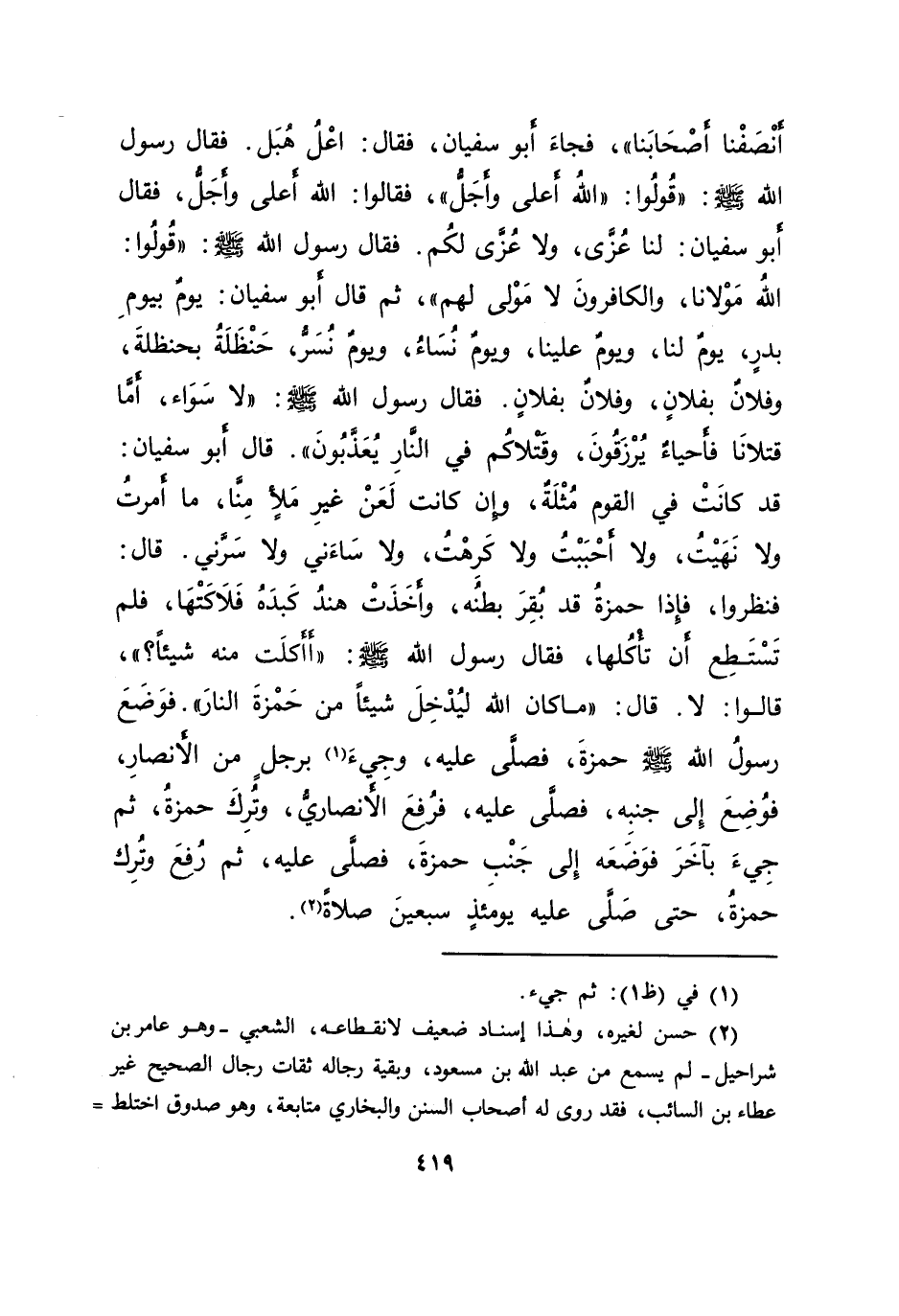أَنْصَفْنَا أَصْحَابَنَا " فَجَاءَ أَبُو سُفْيَانَ، فَقَالَ: اعْلُ هُبَلُ، فَقَالَ رَسُولُ اللهِ صَلَّى اللهُ عَلَيْهِ وَسَلَّمَ: " قُولُوا اللهُ أَعْلَى وَأَجَلُّ "، فَقَالُوا: اللهُ أَعْلَى وَأَجَلُّ، فَقَالَ أَبُو سُفْيَانَ: لَنَا عُزَّى، وَلَا عُزَّى لَكُمْ، فَقَالَ رَسُولُ اللهِ صَلَّى اللهُ عَلَيْهِ وَسَلَّمَ: " قُولُوا اللهُ مَوْلَانَا، وَالْكَافِرُونَ لَا مَوْلَى لَهُمْ "، ثُمَّ قَالَ أَبُو سُفْيَانَ: يَوْمٌ بِيَوْمِ بَدْرٍ يَوْمٌ لَنَا، وَيَوْمٌ عَلَيْنَا، وَيَوْمٌ نُسَاءُ، وَيَوْمٌ نُسَرُّ، حَنْظَلَةُ بِحَنْظَلَةَ، وَفُلَانٌ بِفُلَانٍ، وَفُلَانٌ بِفُلَانٍ، فَقَالَ رَسُولُ اللهِ صَلَّى اللهُ عَلَيْهِ وَسَلَّمَ: " لَا سَوَاءً، أَمَّا قَتْلَانَا فَأَحْيَاءٌ يُرْزَقُونَ، وَقَتْلَاكُمْ فِي النَّارِ يُعَذَّبُونَ "، قَالَ أَبُو سُفْيَانَ: قَدْ كَانَتْ فِي الْقَوْمِ مُثْلَةٌ، وَإِنْ كَانَتْ لَعَنْ غَيْرِ مَلَأٍ مِنَّا، مَا أَمَرْتُ وَلَا نَهَيْتُ، وَلَا أَحْبَبْتُ، وَلَا كَرِهْتُ، وَلَا سَاءَنِي، وَلَا سَرَّنِي، قَالَ: فَنَظَرُوا فَإِذَا حَمْزَةُ قَدْ بُقِرَ بَطْنُهُ، وَأَخَذَتْ هِنْدُ كَبِدَهُ فَلَاكَتْهَا، فَلَمْ تَسْتَطِعْ أَنْ تَأْكُلَهَا، فَقَالَ رَسُولُ اللهِ صَلَّى اللهُ عَلَيْهِ وَسَلَّمَ: " أَأَكَلَتْ مِنْهُ شَيْئًا " قَالُوا: لَا. قَالَ: " مَا كَانَ اللهُ لِيُدْخِلَ شَيْئًا مِنْ حَمْزَةَ النَّارَ "، فَوَضَعَ رَسُولُ اللهِ صَلَّى اللهُ عَلَيْهِ وَسَلَّمَ، حَمْزَةَ، فَصَلَّى عَلَيْهِ، وَجِيءَ (١) بِرَجُلٍ مِنَ الْأَنْصَارِ، فَوُضِعَ إِلَى جَنْبِهِ، فَصَلَّى عَلَيْهِ، فَرُفِعَ الْأَنْصَارِيُّ، وَتُرِكَ حَمْزَةُ، ثُمَّ جِيءَ بِآخَرَ فَوَضَعَهُ إِلَى جَنْبِ حَمْزَةَ فَصَلَّى عَلَيْهِ، ثُمَّ رُفِعَ، وَتُرِكَ حَمْزَةُ حَتَّى صَلَّى عَلَيْهِ يَوْمَئِذٍ سَبْعِينَ صَلَاةً (٢)