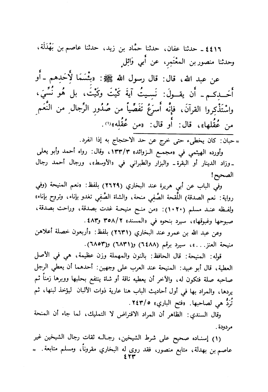 ٤٤١٦ - حَدَّثَنَا عَفَّانُ، حَدَّثَنَا حَمَّادُ بْنُ زَيْدٍ، حَدَّثَنَا عَاصِمٌ ابْنُ بَهْدَلَةَ، وَحَدَّثَنَا مَنْصُورُ بْنُ الْمُعْتَمِرِ، عَنْ أَبِي وَائِلٍ، عَنْ عَبْدِ اللهِ، قَالَ: قَالَ رَسُولُ اللهِ صَلَّى اللهُ عَلَيْهِ وَسَلَّمَ: " بِئْسَمَا لِأَحَدِهِمْ - أَوْ أَحَدِكُمْ - أَنْ يَقُولَ: نَسِيتُ آيَةَ كَيْتَ وَكَيْتَ، بَلْ هُوَ نُسِّيَ، وَاسْتَذْكِرُوا الْقُرْآنَ، فَإِنَّهُ أَسْرَعُ تَفَصِّيًا مِنْ صُدُورِ الرِّجَالِ مِنَ النَّعَمِ مِنْ عُقُلِهَا " قَالَ: أَوْ قَالَ: " مِنْ عُقُلِهِ " (١)