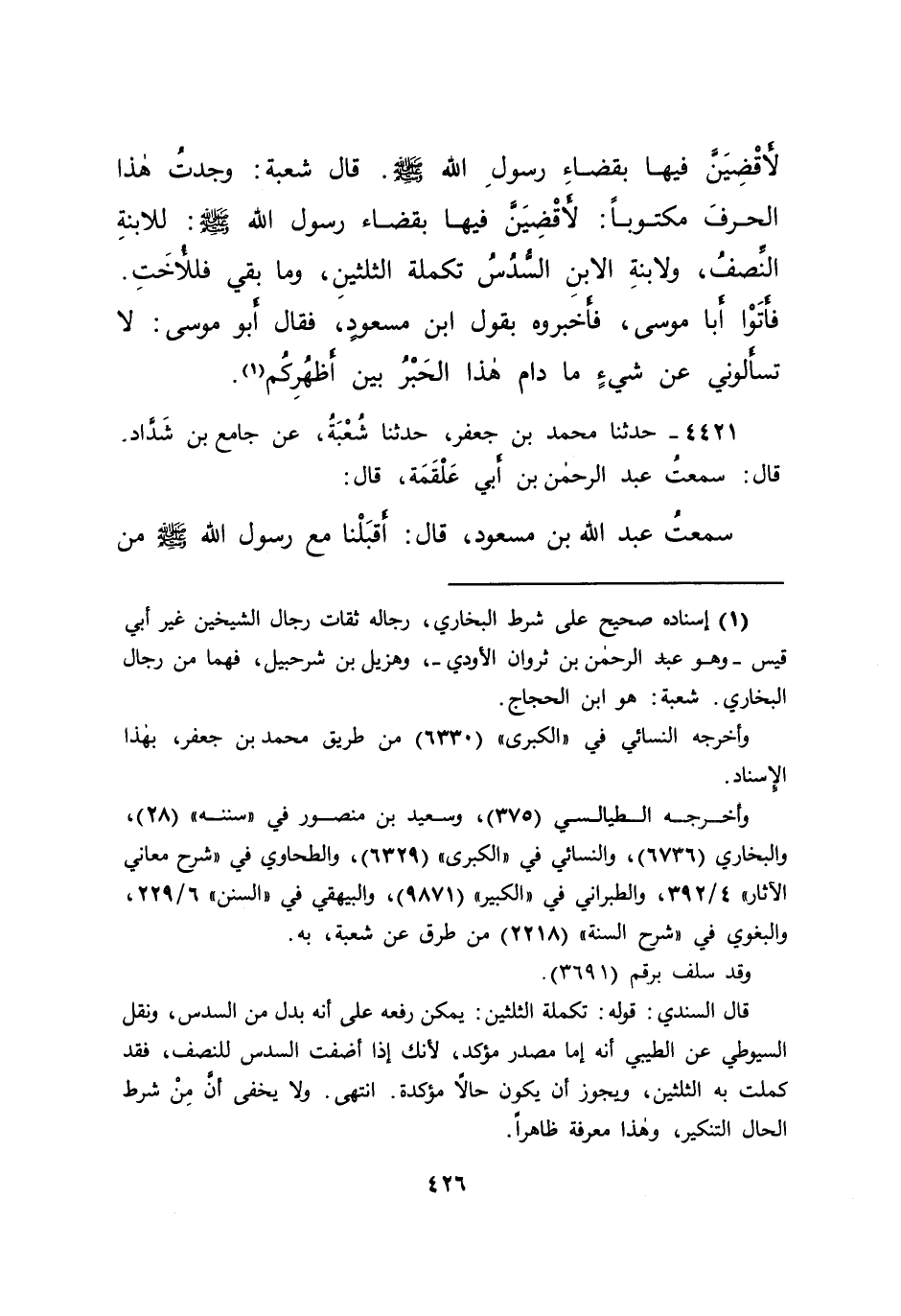 لَأَقْضِيَنَّ فِيهَا بِقَضَاءِ رَسُولِ اللهِ صَلَّى اللهُ عَلَيْهِ وَسَلَّمَ، قَالَ شُعْبَةُ: " وَجَدْتُ هَذَا الْحَرْفَ مَكْتُوبًا: لَأَقْضِيَنَّ فِيهَا بِقَضَاءِ رَسُولِ اللهِ صَلَّى اللهُ عَلَيْهِ وَسَلَّمَ: " لِلِابْنَةِ النِّصْفُ، وَلِابْنَةِ الِابْنِ السُّدُسُ، تَكْمِلَةَ الثُّلُثَيْنِ، وَمَا بَقِيَ فَلِلْأُخْتِ " فَأَتَوْا أَبَا مُوسَى فَأَخْبَرُوهُ: بِقَوْلِ ابْنِ مَسْعُودٍ، فَقَالَ أَبُو مُوسَى: " لَا تَسْأَلُونِي عَنْ شَيْءٍ مَا دَامَ هَذَا الْحَبْرُ بَيْنَ أَظْهُرِكُمْ " (١)