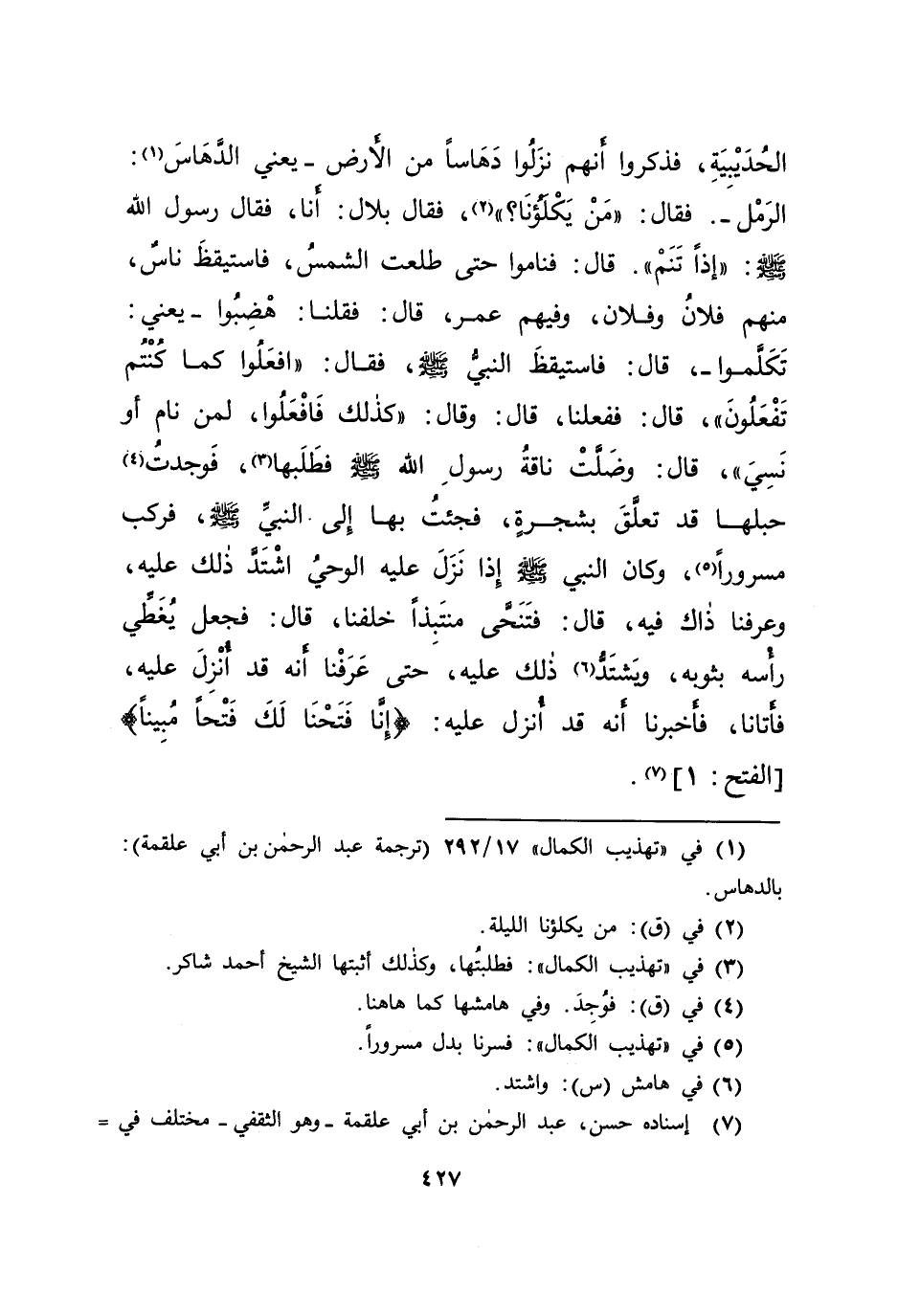 الْحُدَيْبِيَةِ، فَذَكَرُوا أَنَّهُمْ نَزَلُوا دَهَاسًا مِنَ الْأَرْضِ - يَعْنِي الدَّهَاسَ (١) : الرَّمْلَ - فَقَالَ: " مَنْ يَكْلَؤُنَا؟ (٢) " فَقَالَ بِلَالٌ: أَنَا، فَقَالَ رَسُولُ اللهِ صَلَّى اللهُ عَلَيْهِ وَسَلَّمَ: " إِذَنْ تَنَمْ "، قَالَ: فَنَامُوا حَتَّى طَلَعَتِ الشَّمْسُ، فَاسْتَيْقَظَ نَاسٌ، مِنْهُمْ فُلَانٌ وَفُلَانٌ، فِيهِمْ عُمَرُ، قَالَ: فَقُلْنَا: اهْضِبُوا - يَعْنِي تَكَلَّمُوا -، قَالَ: فَاسْتَيْقَظَ النَّبِيُّ صَلَّى اللهُ عَلَيْهِ وَسَلَّمَ، فَقَالَ: " افْعَلُوا كَمَا كُنْتُمْ تَفْعَلُونَ "، قَالَ: فَفَعَلْنَا، قَالَ: وَقَالَ: " كَذَلِكَ فَافْعَلُوا، لِمَنْ نَامَ أَوْ نَسِيَ "، قَالَ: وَضَلَّتْ نَاقَةُ رَسُولِ اللهِ صَلَّى اللهُ عَلَيْهِ وَسَلَّمَ فَطَلَبْتُهَا (٣) ، فَوَجَدْتُ (٤) حَبْلَهَا قَدْ تَعَلَّقَ بِشَجَرَةٍ، فَجِئْتُ بِهَا إِلَى النَّبِيِّ صَلَّى اللهُ عَلَيْهِ وَسَلَّمَ، فَرَكِبَ مَسْرُورًا، (٥) وَكَانَ النَّبِيُّ صَلَّى اللهُ عَلَيْهِ وَسَلَّمَ، إِذَا نَزَلَ عَلَيْهِ الْوَحْيُ اشْتَدَّ ذَلِكَ عَلَيْهِ، وَعَرَفْنَا ذَاِكَ فِيهِ، قَالَ: فَتَنَحَّى مُنْتَبِذًا خَلْفَنَا، قَالَ: فَجَعَلَ يُغَطِّي رَأْسَهُ بِثَوْبِهِ، وَيَشْتَدُّ (٦) ذَلِكَ عَلَيْهِ، حَتَّى عَرَفْنَا أَنَّهُ قَدْ أُنْزِلَ عَلَيْهِ، فَأَتَانَا، فَأَخْبَرَنَا أَنَّهُ قَدْ أُنْزِلَ عَلَيْهِ: (إِنَّا فَتَحْنَا لَكَ فَتْحًا مُبِينًا) [الفتح: ١] (٧)