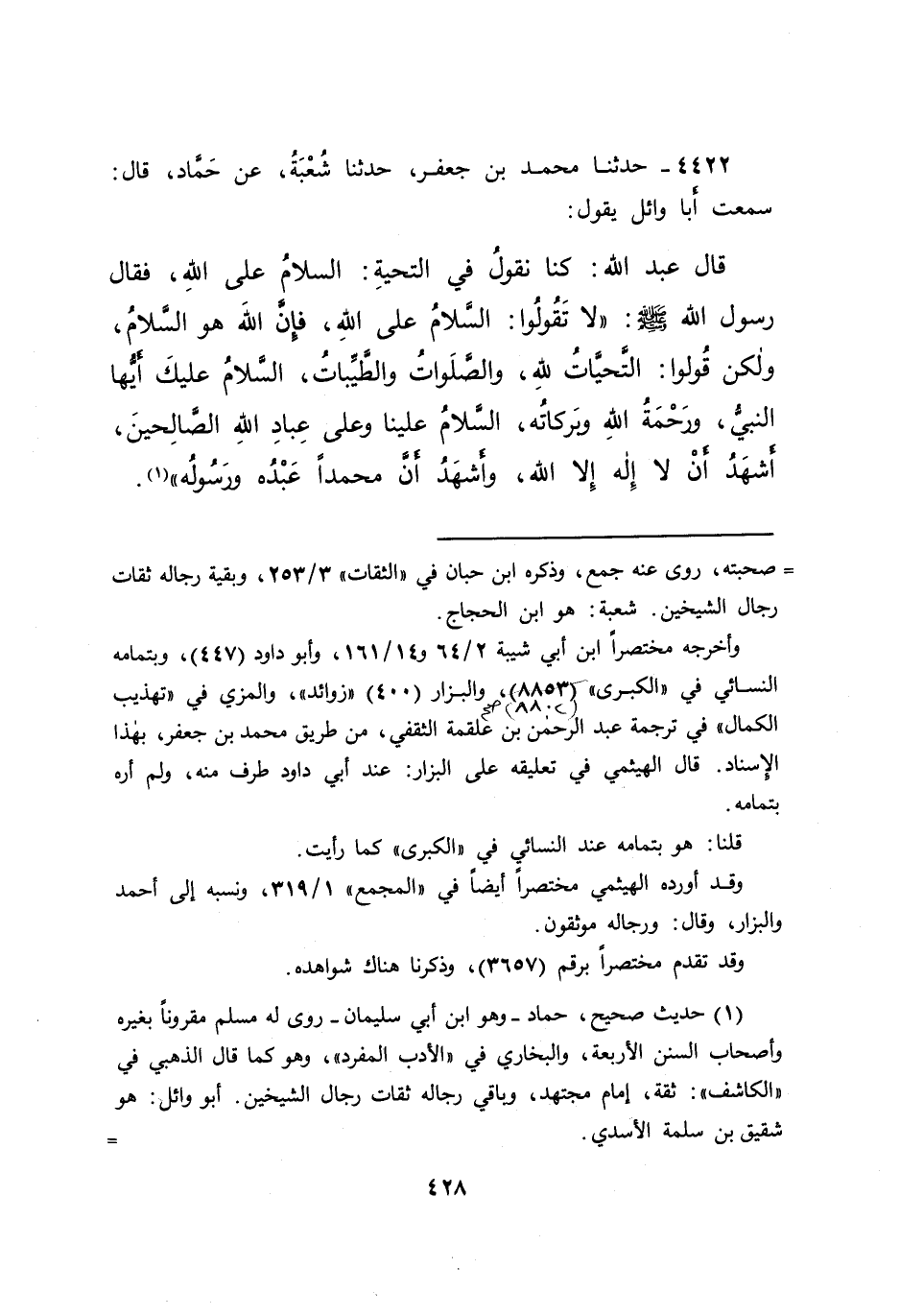٤٤٢٢ - حَدَّثَنَا مُحَمَّدُ بْنُ جَعْفَرٍ، حَدَّثَنَا شُعْبَةُ، عَنْ حَمَّادٍ، قَالَ: سَمِعْتُ أَبَا وَائِلٍ، يَقُولُ: قَالَ عَبْدُ اللهِ: كُنَّا نَقُولُ فِي التَّحِيَّةِ السَّلَامُ عَلَى اللهِ، فَقَالَ رَسُولُ اللهِ صَلَّى اللهُ عَلَيْهِ وَسَلَّمَ: " لَا تَقُولُوا: السَّلَامُ عَلَى اللهِ، فَإِنَّ اللهَ هُوَ السَّلَامُ، وَلَكِنْ قُولُوا: التَّحِيَّاتُ لِلَّهِ، وَالصَّلَوَاتُ وَالطَّيِّبَاتُ، السَّلَامُ عَلَيْكَ أَيُّهَا النَّبِيُّ، وَرَحْمَةُ اللهِ وَبَرَكَاتُهُ، السَّلَامُ عَلَيْنَا وَعَلَى عِبَادِ اللهِ الصَّالِحِينَ، أَشْهَدُ أَنْ لَا إِلَهَ إِلَّا اللهُ، وَأَشْهَدُ أَنَّ مُحَمَّدًا عَبْدُهُ وَرَسُولُهُ " (١)