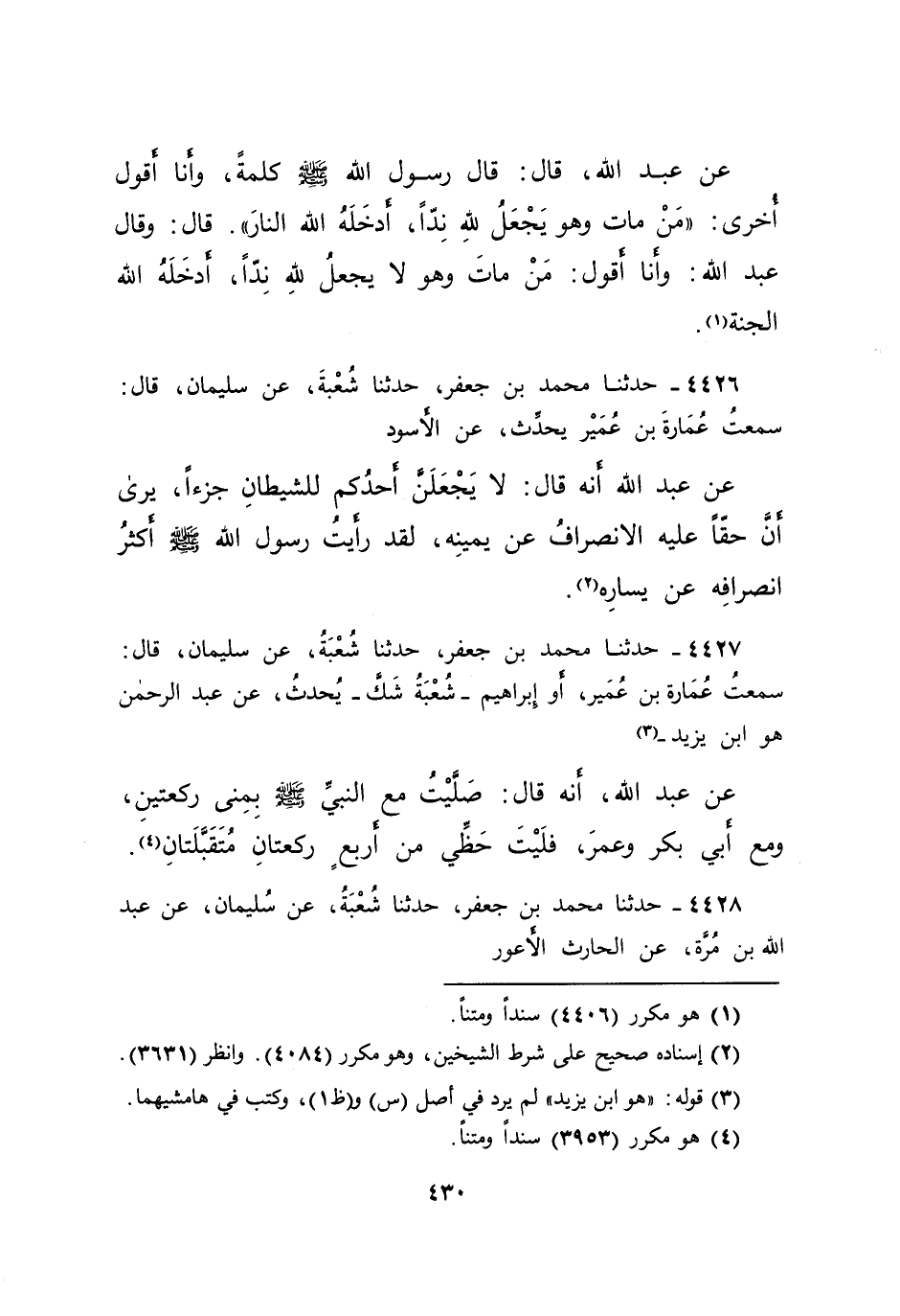 ٤٤٢٦ - حَدَّثَنَا مُحَمَّدُ بْنُ جَعْفَرٍ، حَدَّثَنَا شُعْبَةُ، عَنْ سُلَيْمَانَ، قَالَ: سَمِعْتُ عُمَارَةَ بْنَ عُمَيْرٍ، يُحَدِّثُ، عَنِ الْأَسْوَدِ، عَنْ عَبْدِ اللهِ، أَنَّهُ قَالَ: لَا يَجْعَلَنَّ أَحَدُكُمْ لِلشَّيْطَانِ جُزْءًا، يَرَى أَنَّ حَقًّا عَلَيْهِ الِانْصِرَافُ عَنْ يَمِينِهِ، " لَقَدْ رَأَيْتُ رَسُولَ اللهِ صَلَّى اللهُ عَلَيْهِ وَسَلَّمَ، أَكْثَرُ انْصِرَافِهِ عَنْ يَسَارِهِ " (٢)