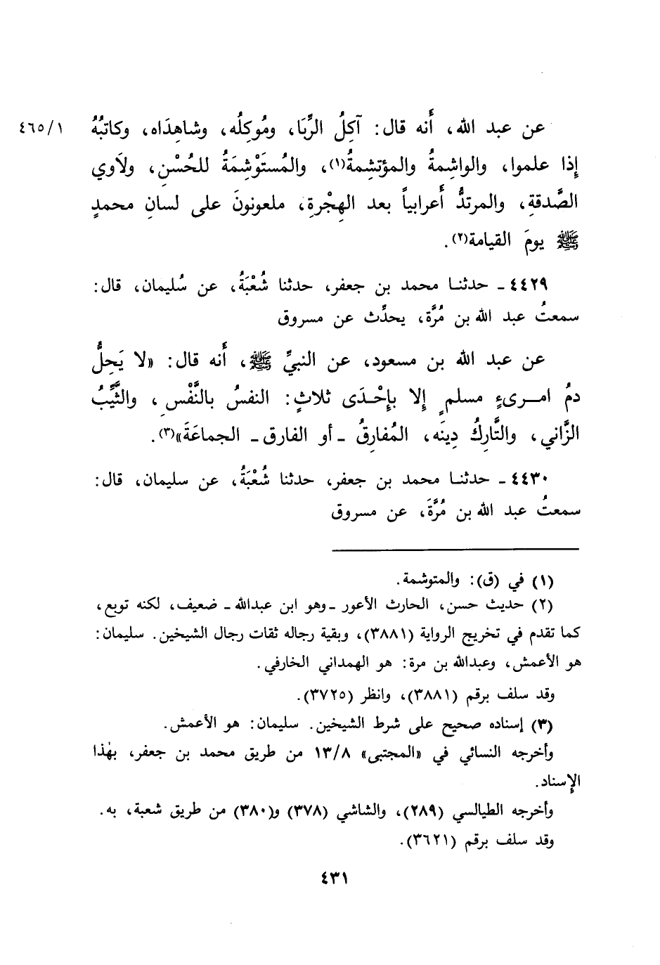 ٤٤٢٩ - حَدَّثَنَا مُحَمَّدُ بْنُ جَعْفَرٍ، حَدَّثَنَا شُعْبَةُ، عَنْ سُلَيْمَانَ، قَالَ: سَمِعْتُ عَبْدَ اللهِ بْنَ مُرَّةَ، يُحَدِّثُ عَنْ مَسْرُوقٍ، عَنْ عَبْدِ اللهِ بْنِ مَسْعُودٍ، عَنِ النَّبِيِّ صَلَّى اللهُ عَلَيْهِ وَسَلَّمَ أَنَّهُ قَالَ: " لَا يَحِلُّ دَمُ امْرِئٍ مُسْلِمٍ إِلَّا بِإِحْدَى ثَلَاثٍ: النَّفْسُ بِالنَّفْسِ، وَالثَّيِّبُ الزَّانِي، وَالتَّارِكُ دِينَهُ، الْمُفَارِقُ - أَوِ الْفَارِقُ - الْجَمَاعَةَ " (٣)