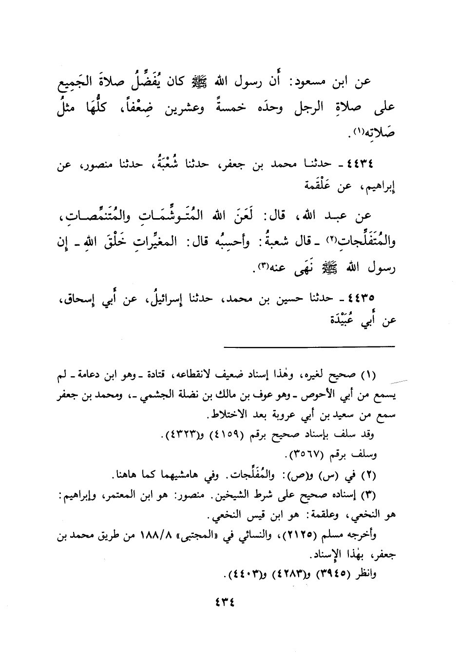٤٤٣٤ - حَدَّثَنَا مُحَمَّدُ بْنُ جَعْفَرٍ، حَدَّثَنَا شُعْبَةُ، حَدَّثَنَا مَنْصُورٌ، عَنْ إِبْرَاهِيمَ، عَنْ عَلْقَمَةَ، عَنْ عَبْدِ اللهِ، قَالَ: " لَعَنَ اللهُ الْمُتَوَشِّمَاتِ، وَالْمُتَنَمِّصَاتِ، وَالْمُتَفَلِّجَاتِ (٢) - قَالَ شُعْبَةُ: وَأَحْسَبُهُ قَالَ: الْمُغَيِّرَاتِ خَلْقَ اللهِ - إِنَّ رَسُولَ اللهِ صَلَّى اللهُ عَلَيْهِ وَسَلَّمَ، نَهَى عَنْهُ " (٣)