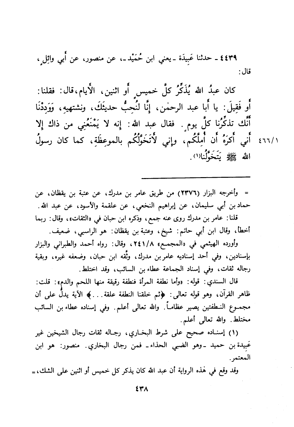 ٤٤٣٩ - حَدَّثَنَا عَبِيدَةُ يَعْنِي ابْنَ حُمَيْدٍ، عَنْ مَنْصُورٍ، عَنْ أَبِي وَائِلٍ، قَالَ: كَانَ عَبْدُ اللهِ يُذَكِّرُ كُلَّ خَمِيسٍ أَوِ اثْنَيْنِ الْأَيَّامَ، قَالَ: فَقُلْنَا: أَوْ فَقِيلَ: يَا أَبَا عَبْدِ الرَّحْمَنِ: إِنَّا لَنُحِبُّ حَدِيثَكَ، وَنَشْتَهِيهِ، وَوَدِدْنَا أَنَّكَ تُذَكِّرُنَا كُلَّ يَوْمٍ، فَقَالَ عَبْدُ اللهِ: " إِنَّهُ لَا يَمْنَعُنِي مِنْ ذَاكَ إِلَّا أَنِّي أَكْرَهُ أَنْ أُمِلَّكُمْ، وَإِنِّي لَأَتَخَوَّلُكُمْ بِالْمَوْعِظَةِ، كَمَا كَانَ رَسُولُ اللهِ صَلَّى اللهُ عَلَيْهِ وَسَلَّمَ، يَتَخَوَّلُنَا " (١)
