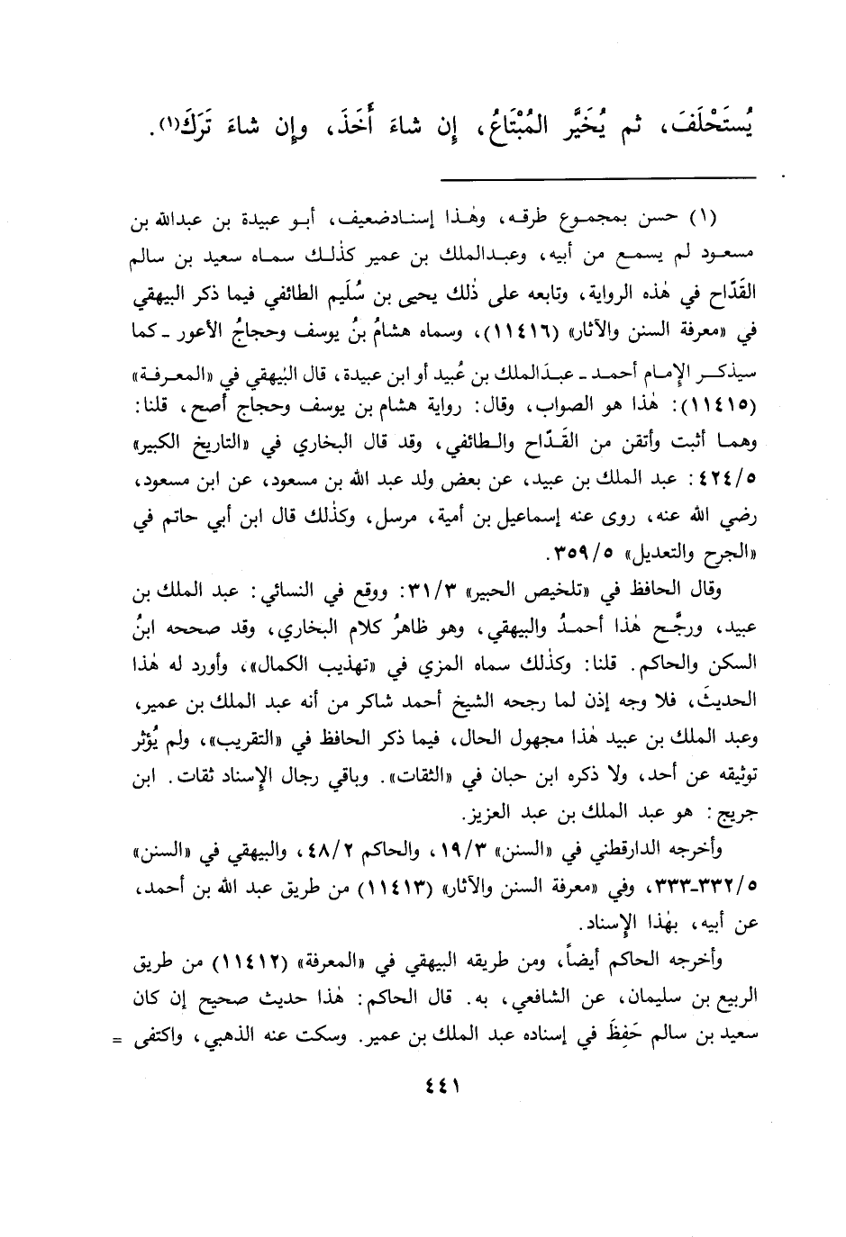 وقال الحافظ في "تلخيص الحبير" ٣/٣١: ووقع في النسائي: عبد الملك بن عبيد، ورجَّح هذا أحمدُ والبيهقي، وهو ظاهرُ كلام البخاري، وقد صححه ابنُ السكن والحاكم. قلنا: وكذلك سماه المزي في "تهذيب الكمال "، وأورد له هذا الحديثَ، فلا وجه إذن لما رجحه الشيخ أحمد شاكر من أنه عبد الملك بن عمير، وعبد الملك بن عبيد هذا مجهول الحال، فيما ذكر الحافظ في "التقريب "، ولم يُؤثر