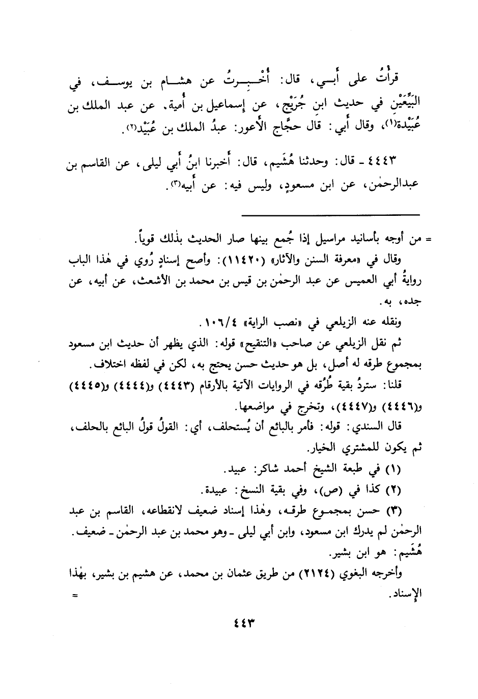 ٤٤٤٣ - قَالَ: وَحَدَّثَنَا هُشَيْمٌ، قَالَ: أَخْبَرَنَا ابْنُ أَبِي لَيْلَى، عَنِ الْقَاسِمِ بْنِ عَبْدِ الرَّحْمَنِ، عَنِ ابْنِ مَسْعُودٍ، وَلَيْسَ فِيهِ عَنْ أَبِيهِ (٣)