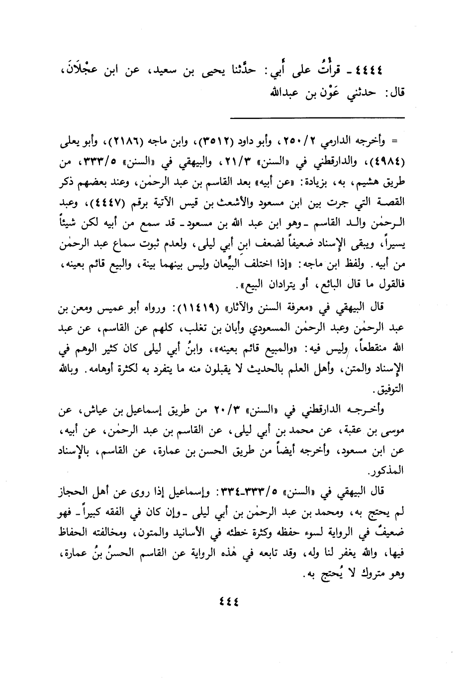 = وأخرجه الدارمي ٢/٢٥٠، وأبو داود (٣٥١٢) ، وابن ماجه (٢١٨٦) ، وأبو يعلى (٤٩٨٤) ، والدارقطني في "السنن " ٣/٢١، والبيهقي في "السنن " ٥/٣٣٣، من طريق هشيم، به، بزيادة: "عن أبيه " بعد القاسم بن عبد الرحمن، وعند بعضهم ذكر القصة التي جرت بين ابن مسعود والأشعث بن قيس الآتية برقم (٤٤٤٧) ، وعبد الرحمن والد القاسم - وهو ابن عبد الله بن مسعود - قد سمع من أبيه لكن شيئاً يسيراً، ويبقى الإسناد ضعيفاً لضعف ابنِ أبي ليلى، ولعدم ثبوت سماع عبد الرحمن