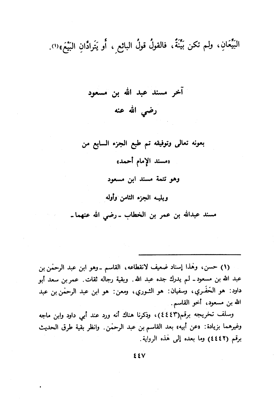 وسلف تخريجه برقم (٤٤٤٣) ، وذكرنا هناك أنه ورد عند أبي داود وابن ماجه وغيرهما بزيادة: "عن أبيه " بعد القاسم بن عبد الرحمن. وانظر بقية طرق الحديث برقم (٤٤٤٢) وما بعده إلى هذه الرواية.