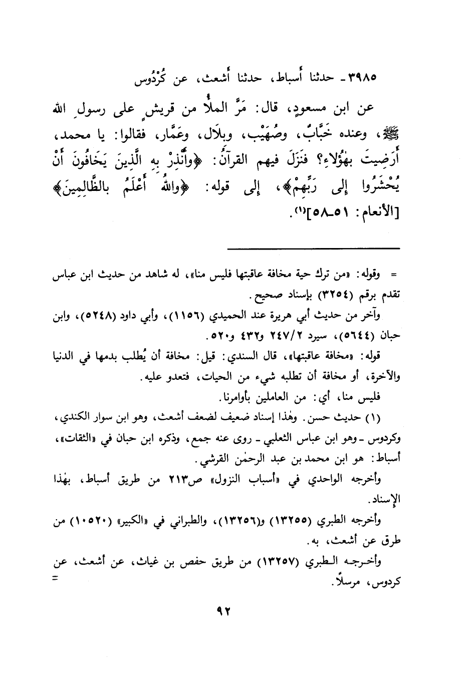 ٣٩٨٥ - حَدَّثَنَا أَسْبَاطٌ، حَدَّثَنَا أَشْعَثُ، عَنْ كُرْدُوسٍ، عَنِ ابْنِ مَسْعُودٍ، قَالَ: " مَرَّ الْمَلَأُ مِنْ قُرَيْشٍ عَلَى رَسُولِ اللهِ صَلَّى اللهُ عَلَيْهِ وَسَلَّمَ، وَعِنْدَهُ خَبَّابٌ، وَصُهَيْبٌ، وَبِلَالٌ، وَعَمَّارٌ، فَقَالُوا: يَا مُحَمَّدُ، أَرَضِيتَ بِهَؤُلَاءِ؟ فَنَزَلَ فِيهِمُ الْقُرْآنُ: {وَأَنْذِرْ بِهِ الَّذِينَ يَخَافُونَ أَنْ يُحْشَرُوا إِلَى رَبِّهِمْ} [الأنعام: ٥١]- إِلَى قَوْلِهِ - {وَاللهُ أَعْلَمُ بِالظَّالِمِينَ} [الأنعام: ٥٨] " (١)