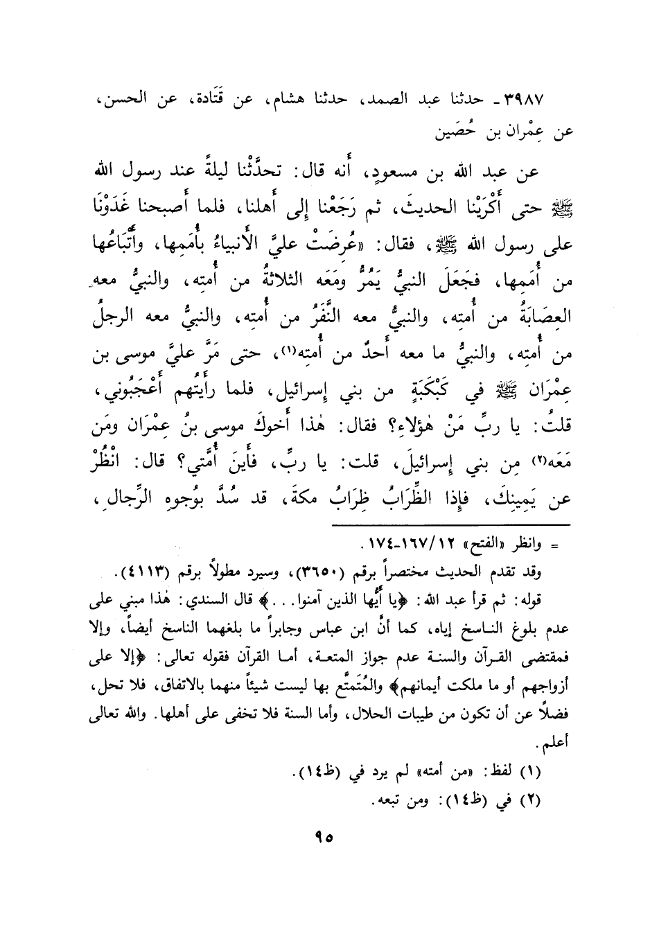 ٣٩٨٧ - حَدَّثَنَا عَبْدُ الصَّمَدِ، حَدَّثَنَا هِشَامٌ، عَنْ قَتَادَةَ، عَنِ الْحَسَنِ، عَنْ عِمْرَانَ بْنِ حُصَيْنٍ، عَنْ عَبْدِ اللهِ بْنِ مَسْعُودٍ، أَنَّهُ قَالَ: تَحَدَّثْنَا لَيْلَةً عِنْدَ رَسُولِ اللهِ صَلَّى اللهُ عَلَيْهِ وَسَلَّمَ حَتَّى أَكْرَيْنَا الْحَدِيثَ، ثُمَّ رَجَعْنَا إِلَى أَهْلِنَا، فَلَمَّا أَصْبَحْنَا، غَدَوْنَا عَلَى رَسُولِ اللهِ صَلَّى اللهُ عَلَيْهِ وَسَلَّمَ، فَقَالَ: " عُرِضَتْ عَلَيَّ الْأَنْبِيَاءُ بِأُمَمِهَا، وَأَتْبَاعُهَا مِنْ أُمَمِهَا، فَجَعَلَ النَّبِيُّ يَمُرُّ وَمَعَهُ الثَّلَاثَةُ مِنْ أُمَّتِهِ، وَالنَّبِيُّ مَعَهُ الْعِصَابَةُ مِنْ أُمَّتِهِ، وَالنَّبِيُّ مَعَهُ النَّفَرُ مِنْ أُمَّتِهِ، وَالنَّبِيُّ مَعَهُ الرَّجُلُ مِنْ أُمَّتِهِ، وَالنَّبِيُّ مَا مَعَهُ أَحَدٌ مِنْ أُمَّتِهِ (١) حَتَّى مَرَّ عَلَيَّ موسَى بْنُ عِمْرَانَ صَلَّى اللهُ عَلَيْهِ وَسَلَّمَ فِي كَبْكَبَةٍ مِنْ بَنِي إِسْرَائِيلَ، فَلَمَّا رَأَيْتُهُمْ أَعْجَبُونِي، قُلْتُ: يَا رَبِّ مَنْ هَؤُلَاءِ؟ فَقَالَ: هَذَا أَخُوكَ مُوسَى بْنُ عِمْرَانَ وَمَنْ مَعَهُ (٢) مِنْ بَنِي إِسْرَائِيلَ، قُلْتُ: يَا رَبِّ، فَأَيْنَ أُمَّتِي؟ قَالَ: انْظُرْ عَنْ يَمِينِكَ، فَإِذَا الظِّرَابُ ظِرَابُ مَكَّةَ، قَدْ سُدَّ بِوُجُوهِ الرِّجَالِ،