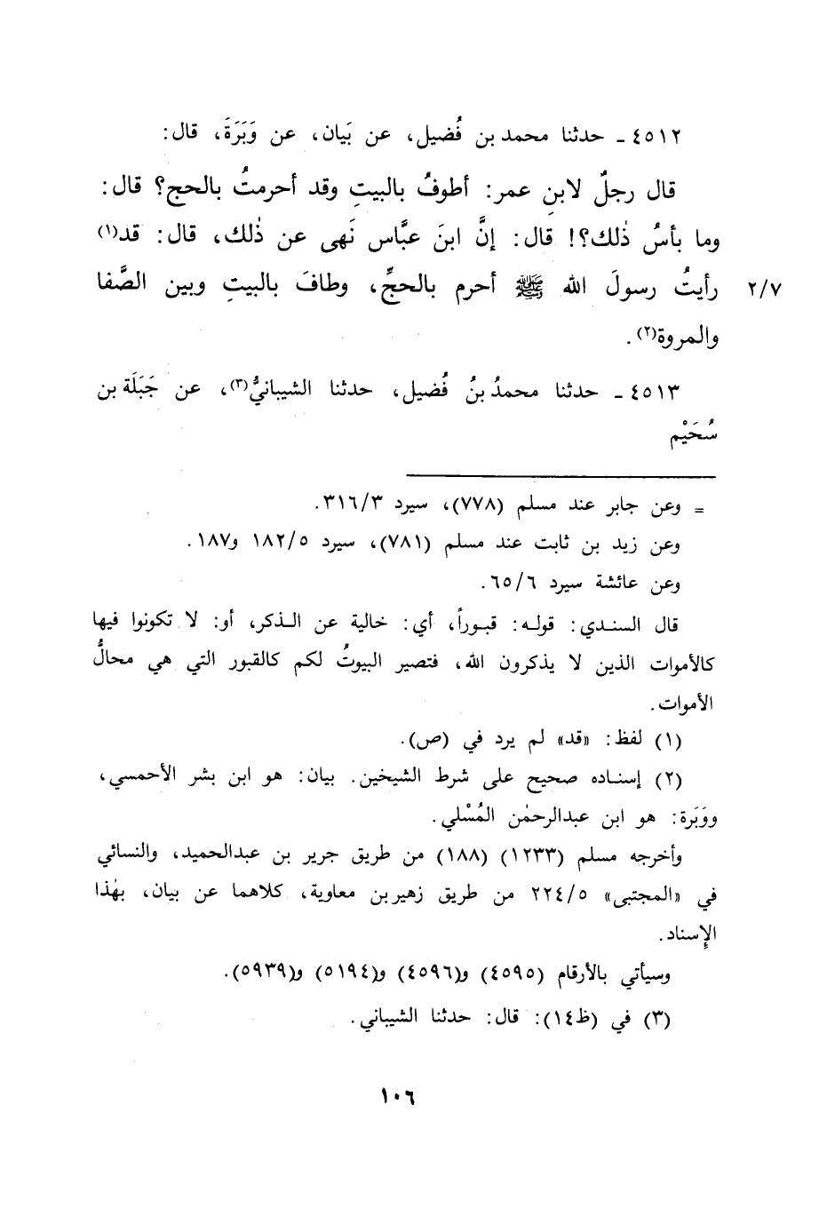 ٤٥١٢ - حَدَّثَنَا مُحَمَّدُ بْنُ فُضَيْلٍ، عَنْ بَيَانٍ، عَنْ، وَبَرَةَ، قَالَ: قَالَ رَجُلٌ لِابْنِ عُمَرَ: أَطُوفُ بِالْبَيْتِ، وَقَدْ أَحْرَمْتُ بِالْحَجِّ؟ قَالَ: وَمَا بَأْسُ ذَلِكَ؟ قَالَ: إِنَّ ابْنَ عَبَّاسٍ نَهَى عَنْ ذَلِكَ، قَالَ: قَدْ (١) رَأَيْتُ رَسُولَ اللهِ صَلَّى اللهُ عَلَيْهِ وَسَلَّمَ: " أَحْرَمَ بِالْحَجِّ، وَطَافَ بِالْبَيْتِ وَبَيْنَ الصَّفَا وَالْمَرْوَةِ " (٢)