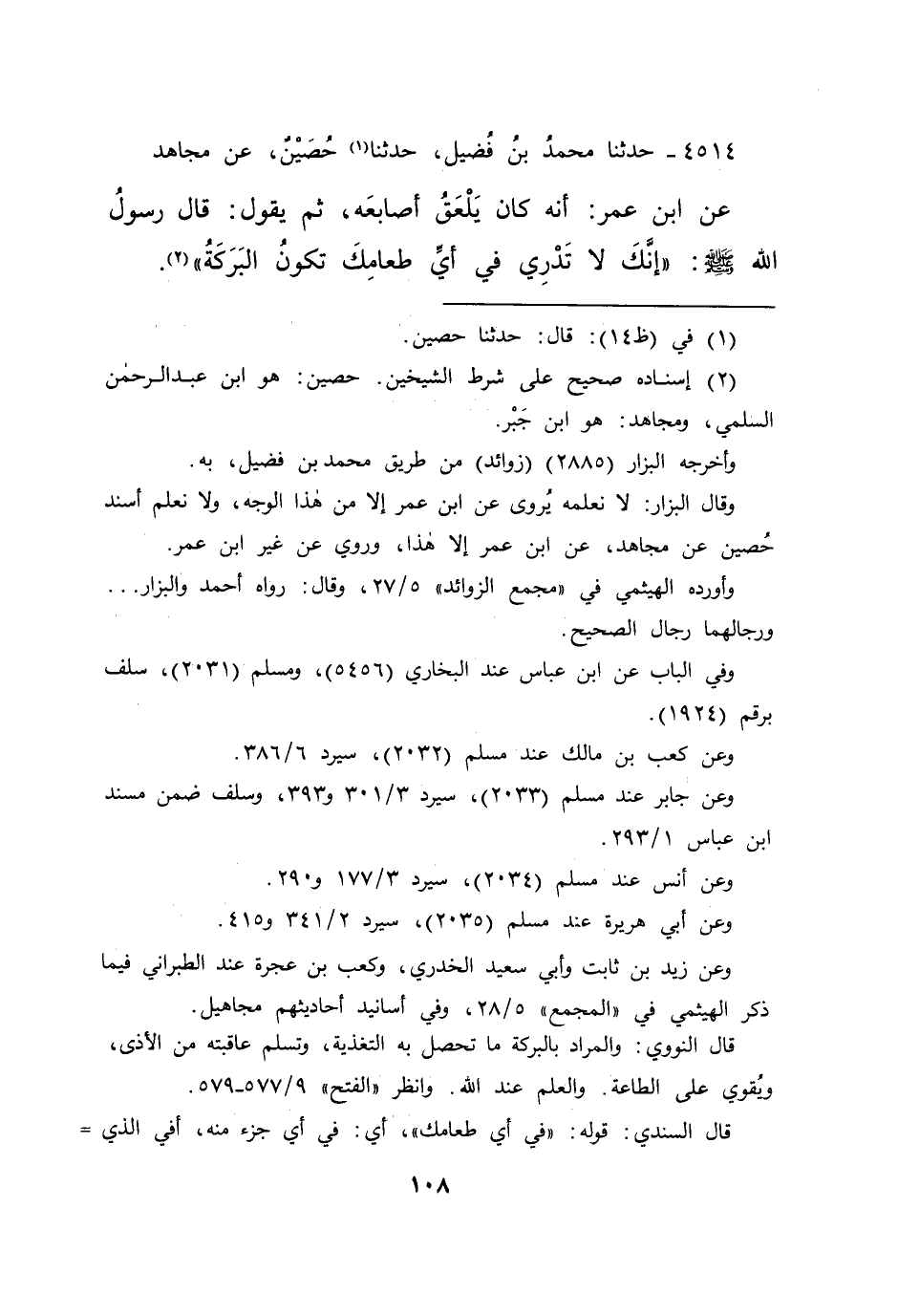 ٤٥١٤ - حَدَّثَنَا مُحَمَّدُ بْنُ فُضَيْلٍ، حَدَّثَنَا (١) حُصَيْنٌ، عَنْ مُجَاهِدٍ، عَنِ ابْنِ عُمَرَ، أَنَّهُ: كَانَ يَلْعَقُ أَصَابِعَهُ، ثُمَّ يَقُولُ: قَالَ رَسُولُ اللهِ صَلَّى اللهُ عَلَيْهِ وَسَلَّمَ: " إِنَّكَ لَا تَدْرِي فِي أَيِّ طَعَامِكَ تَكُونُ الْبَرَكَةُ " (٢)