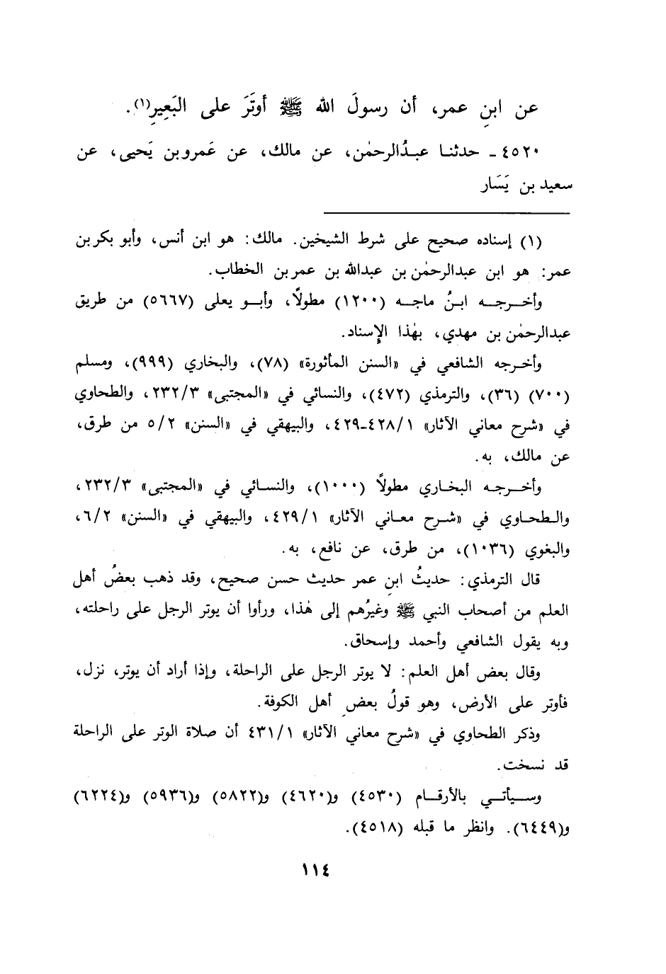 عَنِ ابْنِ عُمَرَ: " أَنَّ رَسُولَ اللهِ صَلَّى اللهُ عَلَيْهِ وَسَلَّمَ أَوْتَرَ عَلَى الْبَعِيرِ " (١)