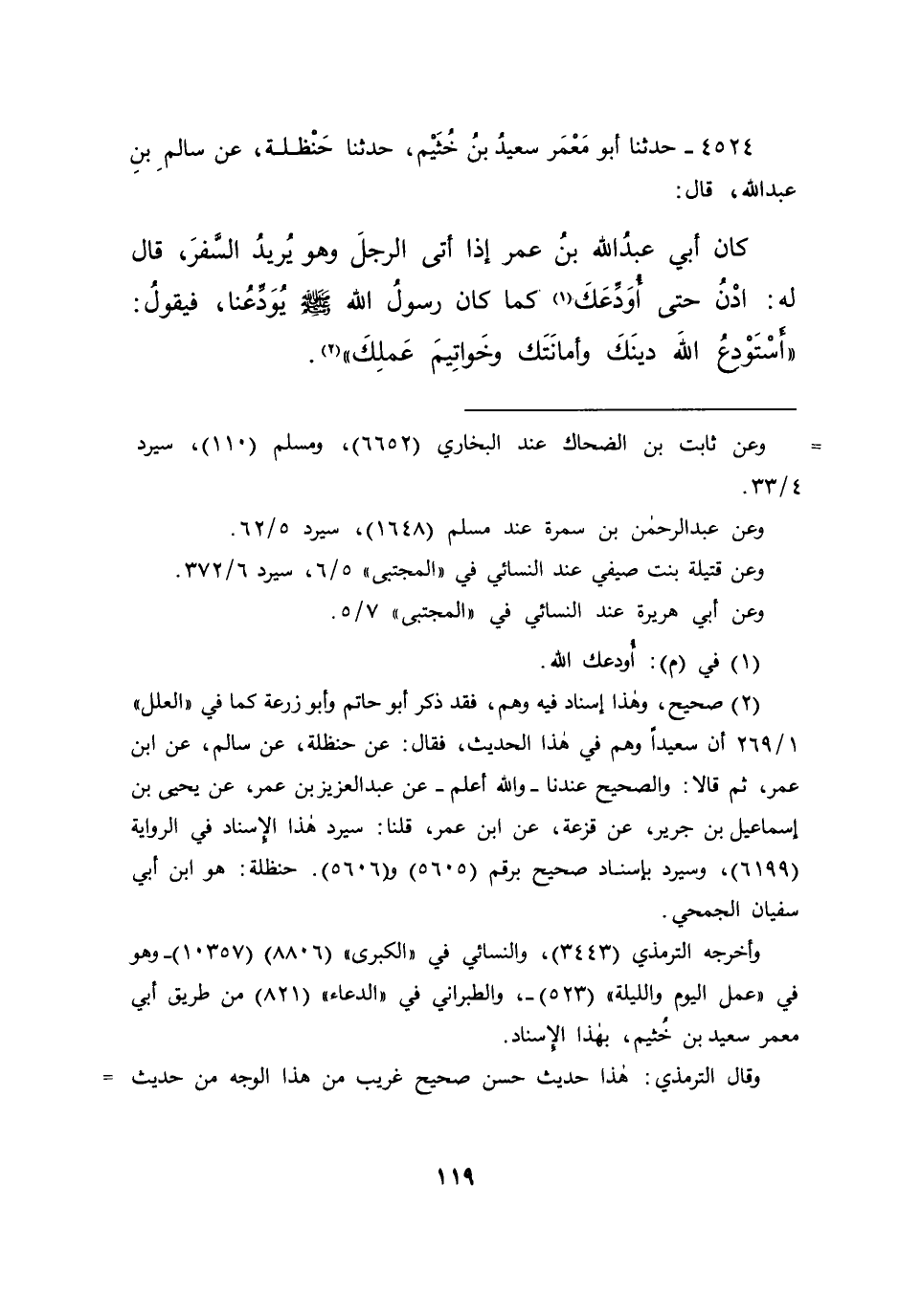 ٤٥٢٤ - حَدَّثَنَا أَبُو مَعْمَرٍ سَعِيدُ بْنُ خُثَيْمٍ، حَدَّثَنَا حَنْظَلَةُ، عَنْ سَالِمِ بْنِ عَبْدِ اللهِ، قَالَ: كَانَ أَبِي عَبْدُ اللهِ بْنُ عُمَرَ إِذَا أَتَى الرَّجُلَ وَهُوَ يُرِيدُ السَّفَرَ، قَالَ لَهُ: ادْنُ حَتَّى أُوَدِّعَكَ (١) كَمَا كَانَ رَسُولُ اللهِ صَلَّى اللهُ عَلَيْهِ وَسَلَّمَ يُوَدِّعُنَا، فَيَقُولُ: " أَسْتَوْدِعُ اللهَ دِينَكَ وَأَمَانَتَكَ وَخَوَاتِيمَ عَمَلِكَ " (٢)