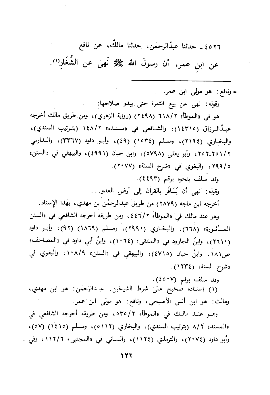 ٤٥٢٦ - حَدَّثَنَا عَبْدُ الرَّحْمَنِ، حَدَّثَنَا مَالِكٌ، عَنْ نَافِعٍ، عَنِ ابْنِ عُمَرَ: " أَنَّ رَسُولَ اللهِ صَلَّى اللهُ عَلَيْهِ وَسَلَّمَ نَهَى عَنِ الشِّغَارِ " (١)