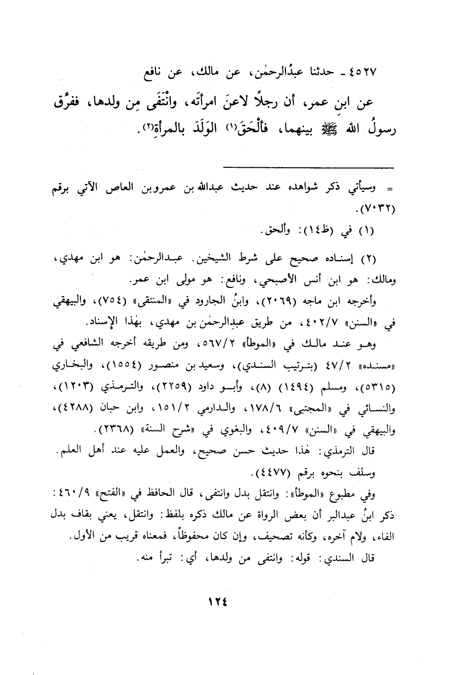 ٤٥٢٧ - حَدَّثَنَا عَبْدُ الرَّحْمَنِ، عَنْ مَالِكٍ، عَنْ نَافِعٍ، عَنْ ابْنِ عُمَرَ: " أَنَّ رَجُلًا لَاعَنَ امْرَأَتَهُ، وَانْتَفَى مِنْ وَلَدِهَا فَفَرَّقَ رَسُولُ اللهِ صَلَّى اللهُ عَلَيْهِ وَسَلَّمَ، بَيْنَهُمَا فَأَلْحَقَ (١) الْوَلَدَ بِالْمَرْأَةِ " (٢)