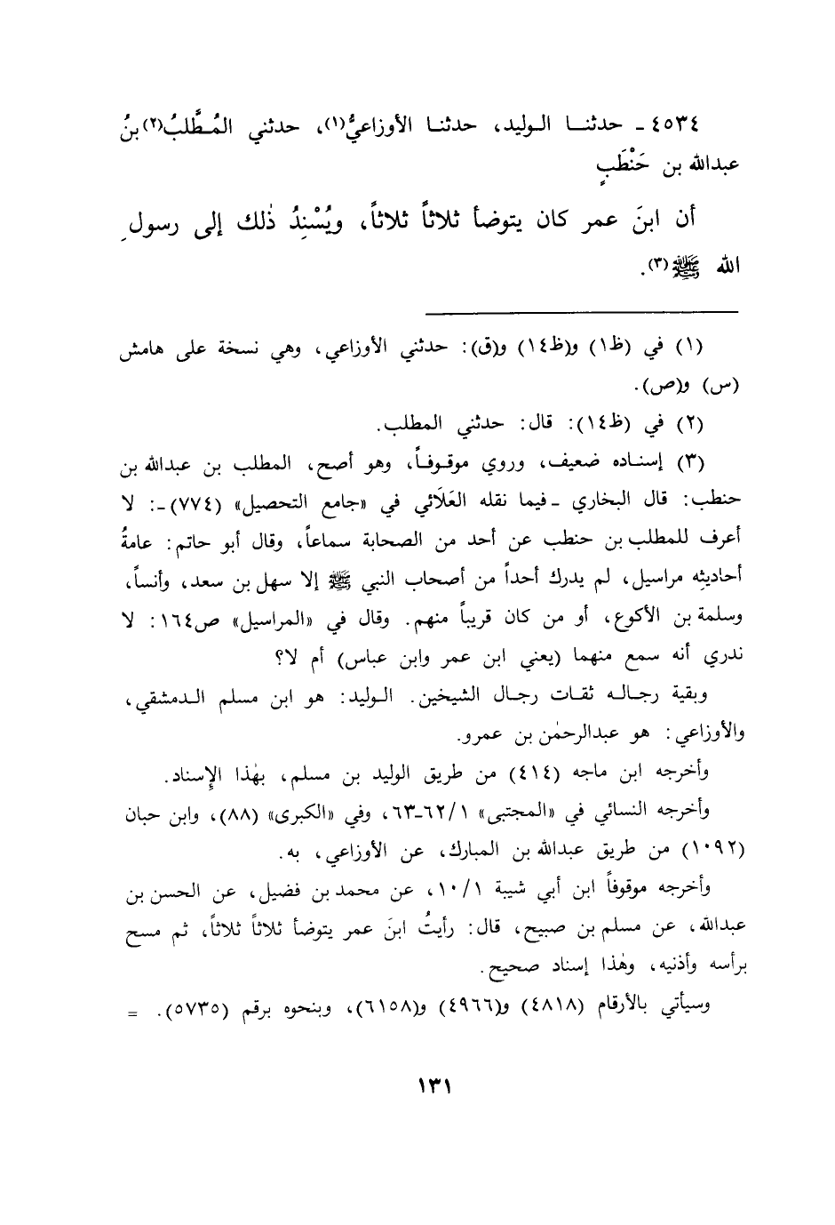 ٤٥٣٤ - حَدَّثَنَا الْوَلِيدُ، حَدَّثَنَا الْأَوْزَاعِيُّ، (١) حَدَّثَنِي الْمُطَّلِبُ (٢) بْنُ عَبْدِ اللهِ بْنِ حَنْطَبٍ، أَنَّ ابْنَ عُمَرَ: كَانَ " يَتَوَضَّأُ ثَلَاثًا ثَلَاثًا، وَيُسْنِدُ ذَلِكَ إِلَى رَسُولِ اللهِ صَلَّى اللهُ عَلَيْهِ وَسَلَّمَ " (٣)
