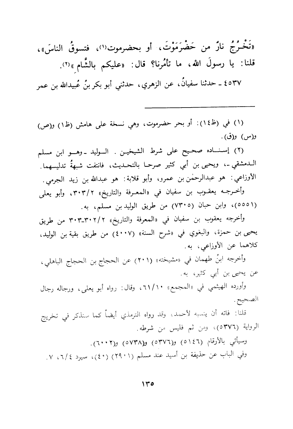 تَخْرُجُ نَارٌ مِنْ حَضْرَمَوْتَ أَوْ بِحَضْرَمَوْتَ (١) فَتَسُوقُ النَّاسَ ". قُلْنَا: يَا رَسُولَ اللهِ مَا تَأْمُرُنَا؟، قَالَ: " عَلَيْكُمْ بِالشَّامِ " (٢)