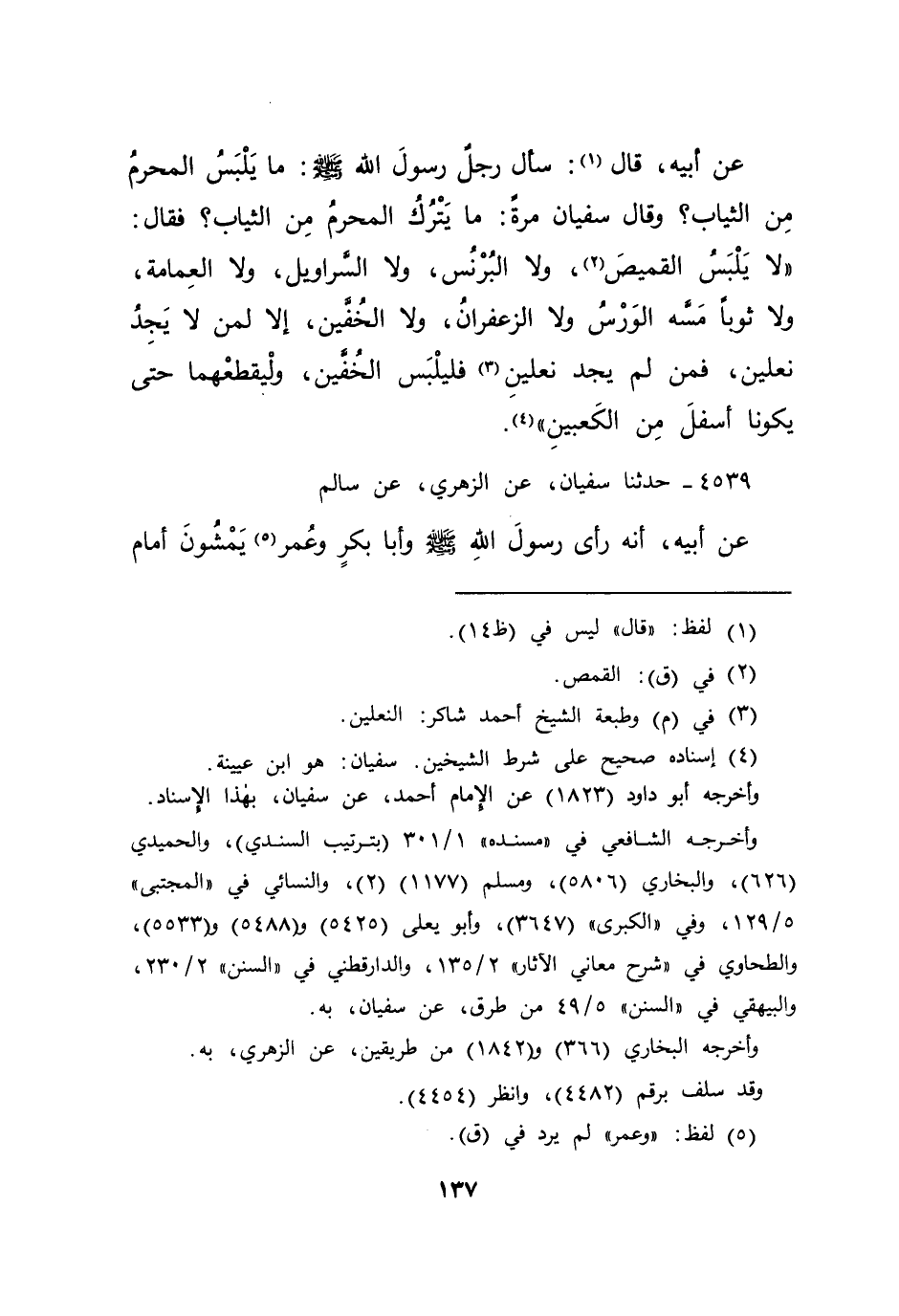 عَنْ أَبِيهِ، قَالَ: (١) سَأَلَ رَجُلٌ رَسُولَ اللهِ صَلَّى اللهُ عَلَيْهِ وَسَلَّمَ، مَا يَلْبَسُ الْمُحْرِمُ مِنَ الثِّيَابِ؟ وَقَالَ سُفْيَانُ مَرَّةً: مَا يَتْرُكُ الْمُحْرِمُ مِنَ الثِّيَابِ؟ فَقَالَ: " لَا يَلْبَسُ الْقَمِيصَ، (٢) وَلَا الْبُرْنُسَ، وَلَا السَّرَاوِيلَ، وَلَا الْعِمَامَةَ، وَلَا ثَوْبًا مَسَّهُ الْوَرْسُ، وَلَا الزَّعْفَرَانُ، وَلَا الْخُفَّيْنِ، إِلَّا لِمَنْ لَا يَجِدُ نَعْلَيْنِ، فَمَنْ لَمْ يَجِدْ نَعْلَيْنِ (٣) فَلْيَلْبَسِ الْخُفَّيْنِ، وَلْيَقْطَعْهُمَا حَتَّى يَكُونَا أَسْفَلَ مِنَ الْكَعْبَيْنِ " (٤)