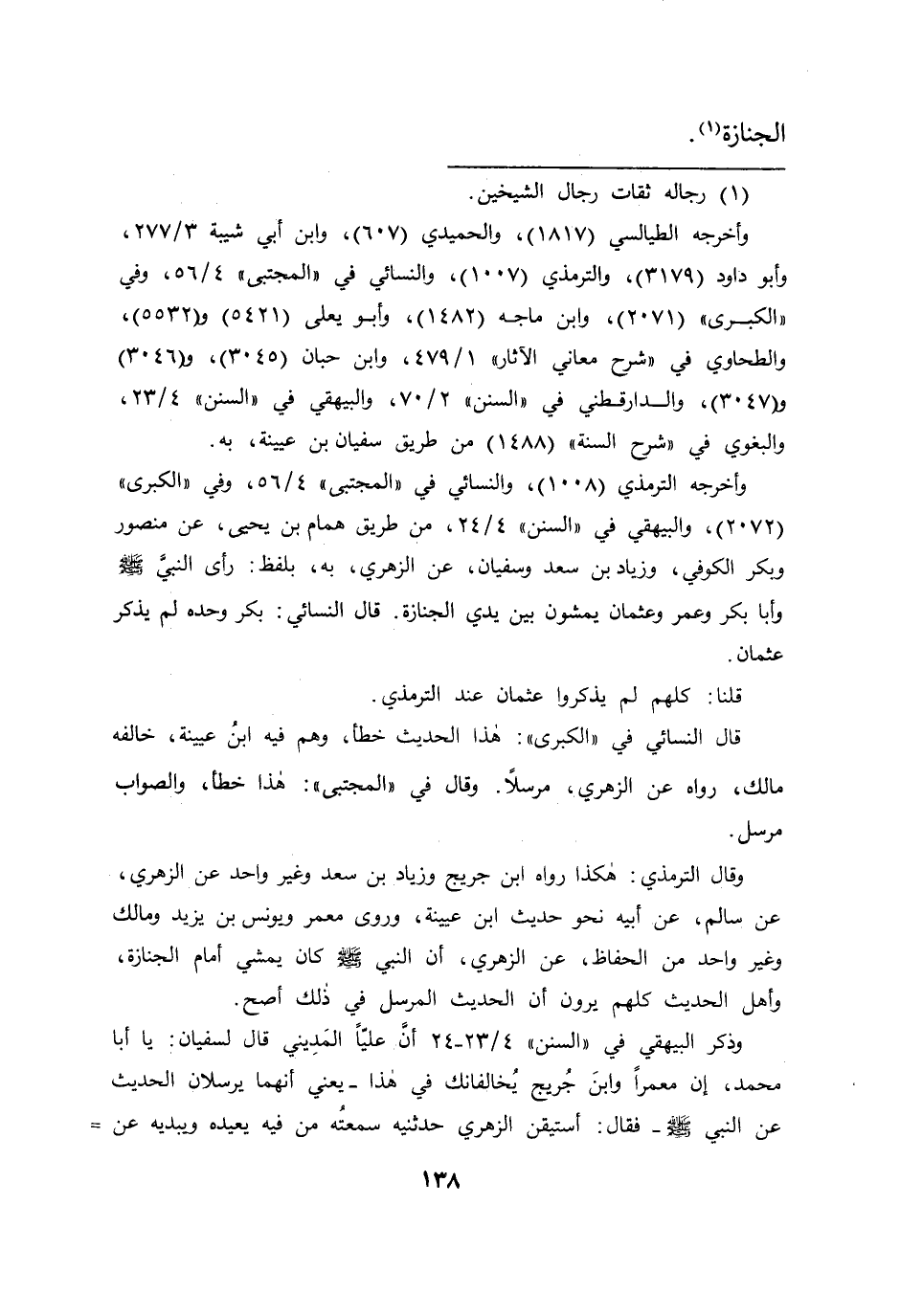 وقال الترمذي: هكذا رواه ابن جريج وزياد بن سعد وغير واحد عن الزهري، عن سالم، عن أبيه نحو حديث ابن عيينة، وروى معمر ويونس بن يزيد ومالك وغير واحد من الحفاظ، عن الزهري، أن النبي صَلَّى اللهُ عَلَيْهِ وَسَلَّمَ كان يمشي أمام الجنازة، وأهل الحديث كلهم يرون أن الحديث المرسل في ذلك أصح.