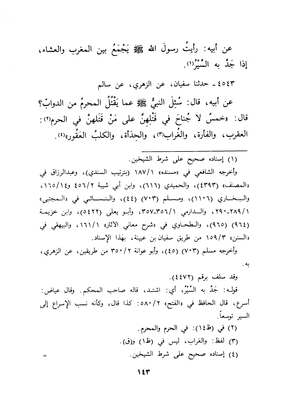٤٥٤٣ - حَدَّثَنَا سُفْيَانُ، عَنِ الزُّهْرِيِّ، عَنْ سَالِمٍ، عَنْ أَبِيهِ، قَالَ: سُئِلَ النَّبِيُّ صَلَّى اللهُ عَلَيْهِ وَسَلَّمَ، عَمَّا يَقْتُلُ الْمُحْرِمُ مِنَ الدَّوَابِّ؟، قَالَ: " خَمْسٌ لَا جُنَاحَ فِي قَتْلِهِنَّ عَلَى مَنْ قَتَلَهُنَّ فِي الْحَرَمِ: (٢) الْعَقْرَبُ، وَالْفَأْرَةُ، وَالْغُرَابُ، (٣) وَالْحِدَأَةُ، وَالْكَلْبُ الْعَقُورُ " (٤)