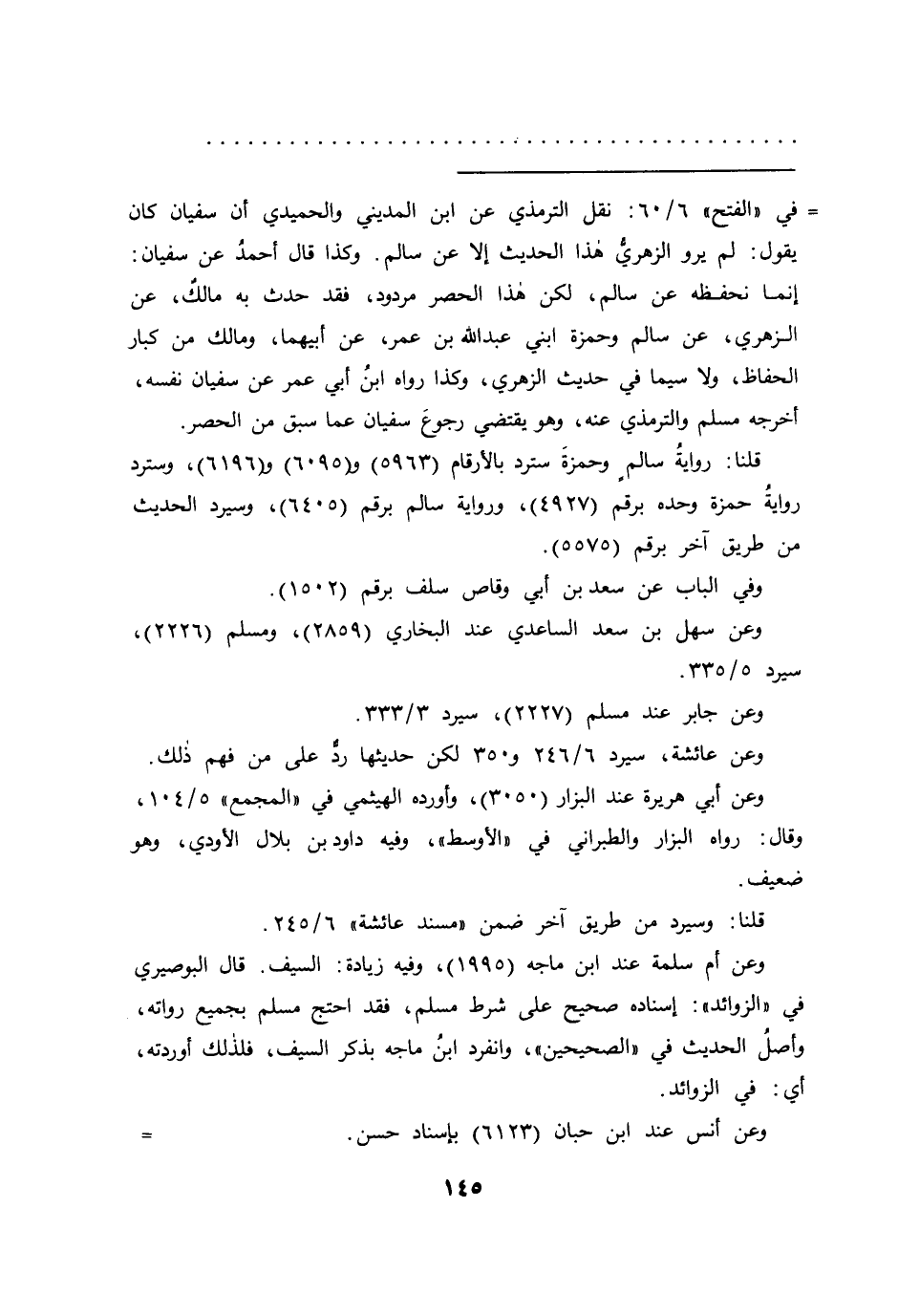 =في "الفتح" ٦/٦٠: نقل الترمذي عن ابن المديني والحميدي أن سفيان كان يقول: لم يرو الزهرىُّ هذا الحديث إلا عن سالم. وكذا قال أحمدُ عن سفيان: إنما نحفظه عن سالم، لكن هذا الحصر مردود، فقد حدث به مالك، عن الزهري، عن سالم وحمزة ابني عبد الله بن عمر، عن أبيهما، ومالك من كبار الحفاظ، ولا سيما في حديث الزهري، وكذا رواه ابنُ أبي عمر عن سفيان نفسه، أخرجه مسلم والترمذي عنه، وهو يقتضي رجوع سفيان عما سبق من الحصر.