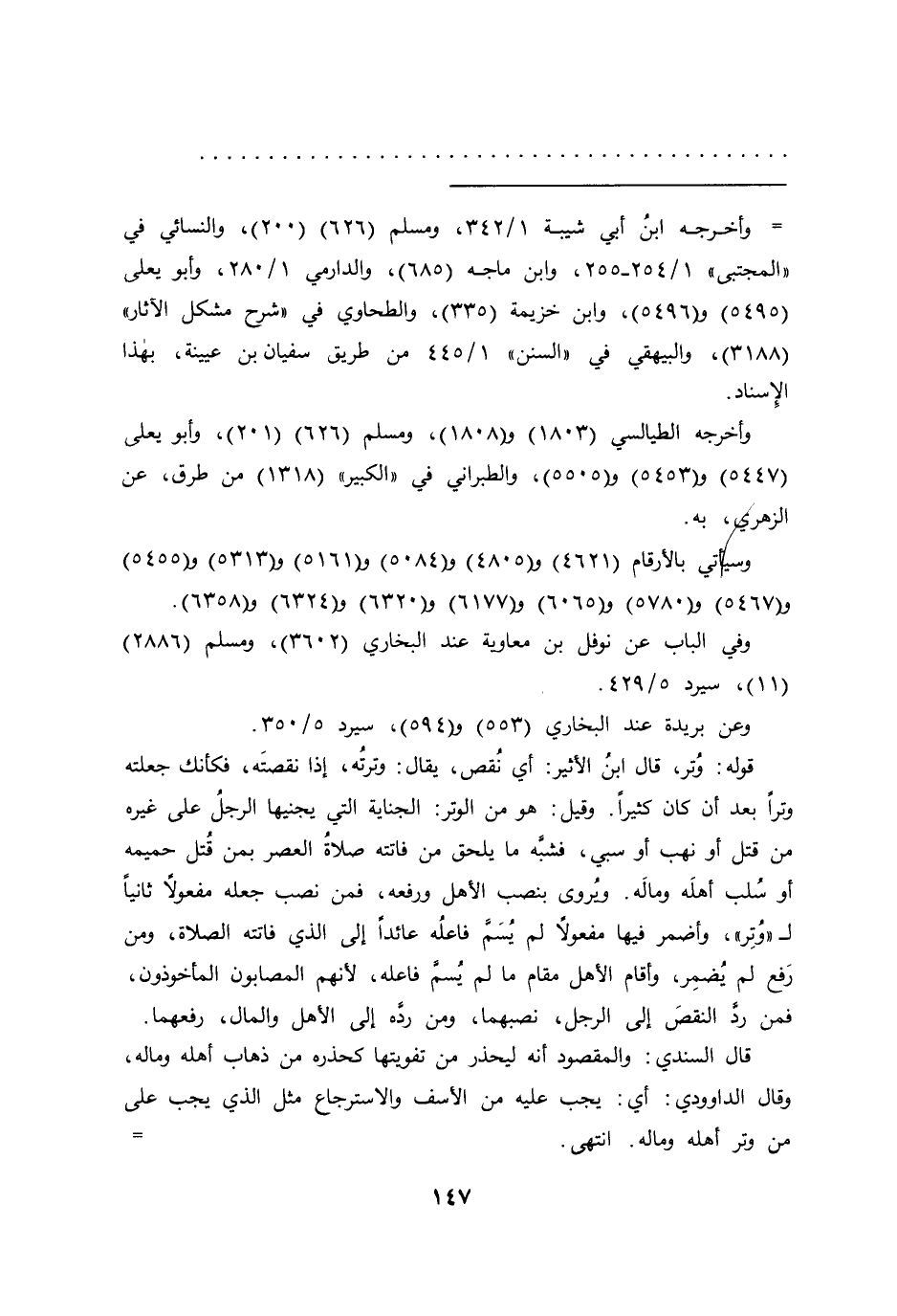 قوله: وُتر، قال ابن الأثير: أي نُقص، يقال: وترتُه، إذا نقصته، فكأنك جعلته وتراً بعد أن كان كثيراً. وقيل: هو من الوتر: الجناية التي يجنيها الرجلُ على غيره من قتل أو نهب أو سبي، فشبه ما يلحق من فاتته صلاةُ العصر بمن قُتل حميمه أو سُلب أهله وماله. وُيروى بنصب الأهل ورفعه، فمن نصب جعله مفعولاً ثانياً ل"وُتر"، وأضمر فيها مفعولاً لم يُسمَّ فاعلُه عائداً إلى الذي فاتته الصلاة، ومن رفع لم يُضمر، وأقام الأهل مقام ما لم يُسم فاعله، لأنهم المصابون المأخوذون، فمن رد النقص إلى الرجل، نصبهما، ومن ردًه إلى الأهل والمال، رفعهما.