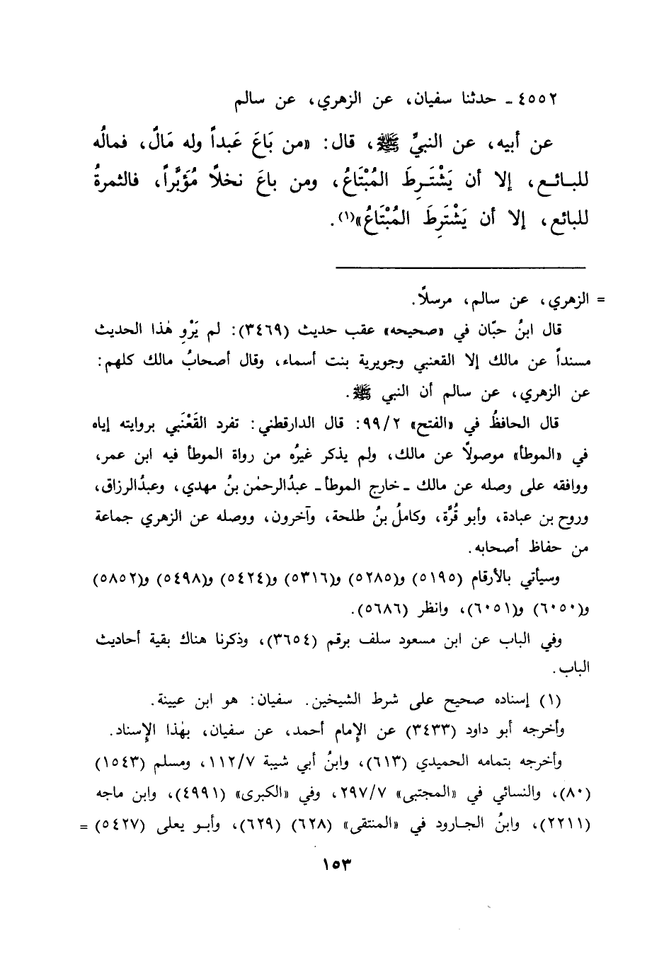 ٤٥٥٢ - حَدَّثَنَا سُفْيَانُ، عَنِ الزُّهْرِيِّ، عَنْ سَالِمٍ، عَنْ أَبِيهِ، عَنِ النَّبِيِّ صَلَّى اللهُ عَلَيْهِ وَسَلَّمَ قَالَ: " مَنْ بَاعَ عَبْدًا وَلَهُ مَالٌ، فَمَالُهُ لِلْبَائِعِ، إِلَّا أَنْ يَشْتَرِطَ الْمُبْتَاعُ، وَمَنْ بَاعَ نَخْلًا مُؤَبَّرًا، فَالثَّمَرَةُ لِلْبَائِعِ، إِلَّا أَنْ يَشْتَرِطَ الْمُبْتَاعُ " (١)