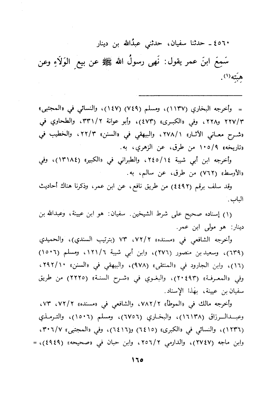 ٤٥٦٠ - حَدَّثَنَا سُفْيَانُ، حَدَّثَنِي عَبْدُ اللهِ بْنُ دِينَارٍ، سَمِعَ ابْنَ عُمَرَ يَقُولُ: " نَهَى رَسُولُ اللهِ صَلَّى اللهُ عَلَيْهِ وَسَلَّمَ، عَنْ بَيْعِ الْوَلَاءِ، وَعَنْ هِبَتِهِ " (١)