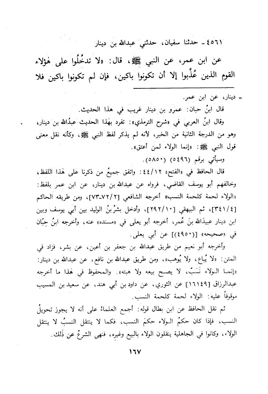 في "صحيحه " [ (٤٩٥٠) ] عن أبي يعلى وأخرجه أبو نعيم من طريق عبد الله بن جعفر بن أعين، عن بشر، فزاد في، المتن: "لا يُباع، ولا يُوهب "، ومن طريق عبد الله بن نافع، عن عبد اللة بن دينار: "إنما الولاء نسب، لا يصح بيعه ولا هبته ". والمحفوظ في هذا ما أيخرجه عبد الرزاق [١٦١٤٩] عن الثوري، عن داود بن أبي هند، عن سعيد بن المسيب موقوفاً عليه: الولاء لحمة كلحمة النسب.