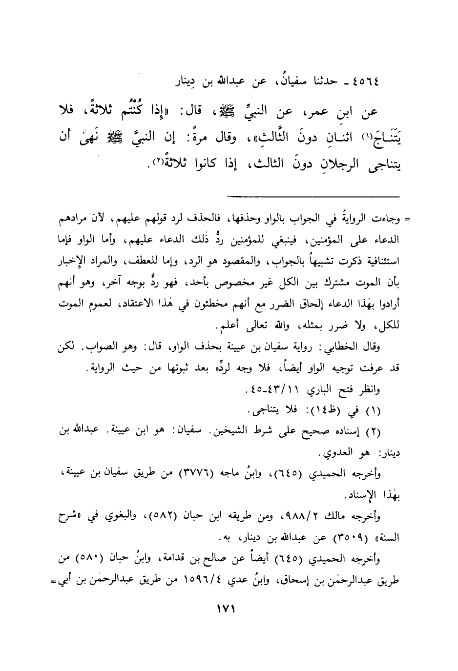 ٤٥٦٤ - حَدَّثَنَا سُفْيَانُ، عَنْ عَبْدِ اللهِ بْنِ دِينَارٍ، عَنِ ابْنِ عُمَرَ، عَنِ النَّبِيِّ صَلَّى اللهُ عَلَيْهِ وَسَلَّمَ قَالَ: " إِذَا كُنْتُمْ ثَلَاثَةً، فَلَا يَتَنَاجَ (١) اثْنَانِ دُونَ الثَّالِثِ "، وَقَالَ مَرَّةً: " إِنَّ النَّبِيَّ صَلَّى اللهُ عَلَيْهِ وَسَلَّمَ، نَهَى أَنْ يَتَنَاجَى الرَّجُلَانِ دُونَ الثَّالِثِ، إِذَا كَانُوا ثَلَاثَةً " (٢)
