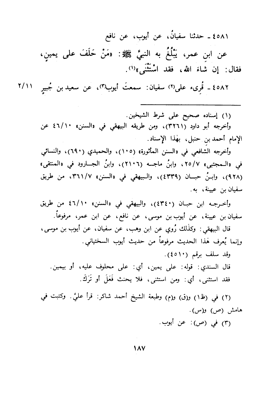 ٤٥٨١ - حَدَّثَنَا سُفْيَانُ، عَنْ أَيُّوبَ، عَنْ نَافِعٍ، عَنِ ابْنِ عُمَرَ، يَبْلُغُ بِهِ النَّبِيَّ صَلَّى اللهُ عَلَيْهِ وَسَلَّمَ: " مَنْ حَلَفَ عَلَى يَمِينٍ، فَقَالَ: إِنْ شَاءَ اللهُ، فَقَدِ اسْتَثْنَى " (١)
