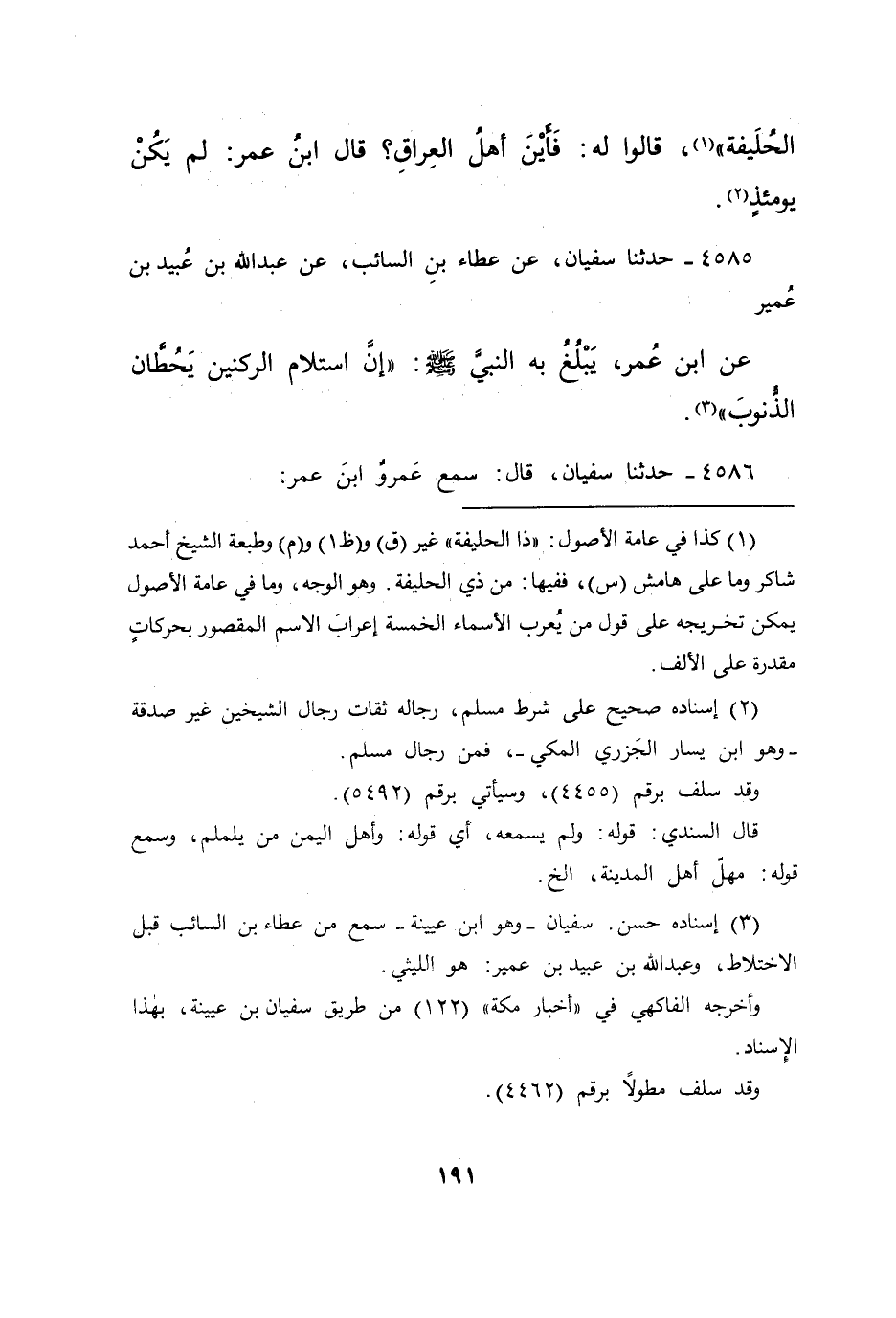 ٤٥٨٥ - حَدَّثَنَا سُفْيَانُ، عَنْ عَطَاءِ بْنِ السَّائِبِ، عَنْ عَبْدِ اللهِ بْنِ عُبَيْدِ بْنِ عُمَيْرٍ، عَنِ ابْنِ عُمَرَ، يَبْلُغُ بِهِ النَّبِيَّ صَلَّى اللهُ عَلَيْهِ وَسَلَّمَ: " إِنَّ اسْتِلَامَ الرُّكْنَيْنِ يَحُطَّانِ الذُّنُوبَ " (٣)