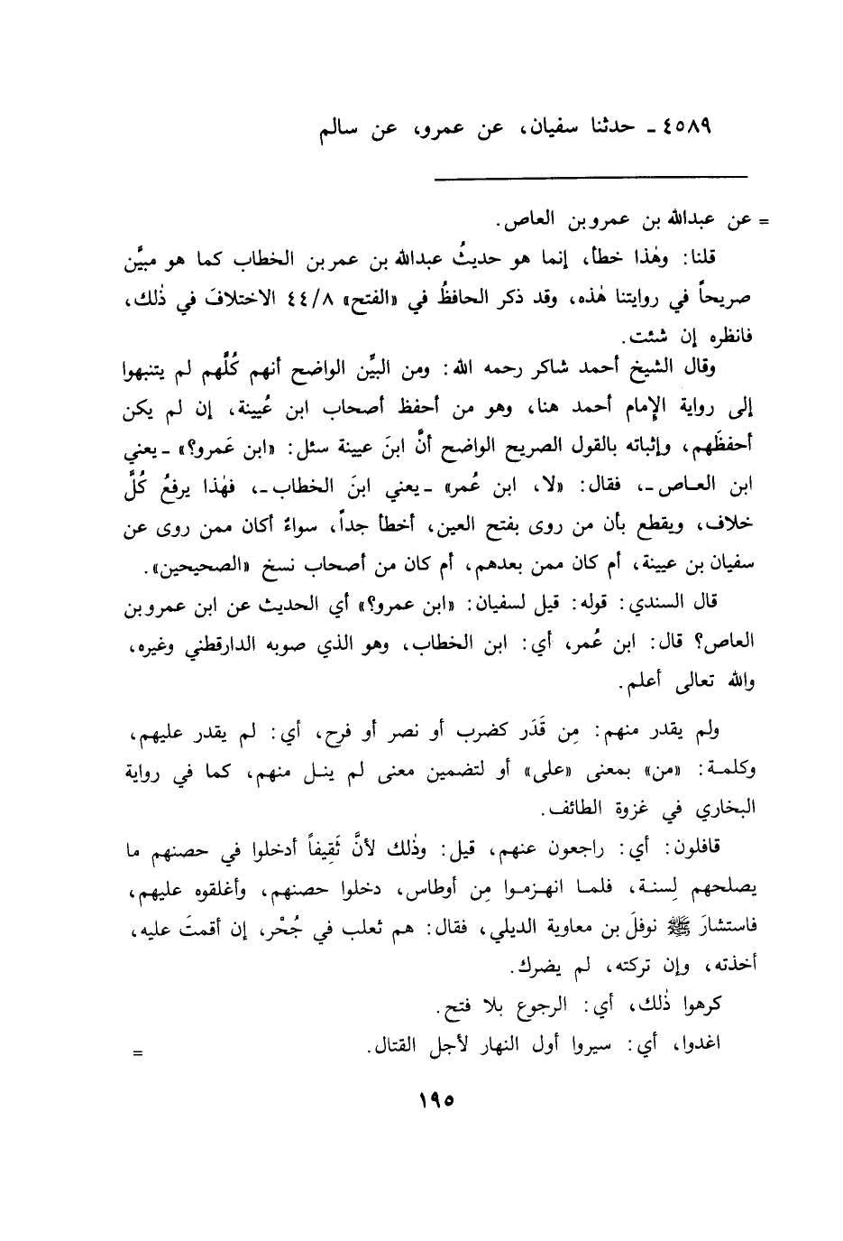 وقال الشيخ أحمد شاكر رحمه الله: ومن البيِّن الواضح أنهم كُلهم لم يتنبهوا إلى رواية الإمام أحمد هنا، وهو من أحفظ أصحاب ابن عُيينة، إن لم يكن أحفظهم، وإثباته بالقول الصريح الواضح أن ابن عيينة سئل: "ابن عمرو؟ " - يعني ابن العاص -، فقال: "لا، ابن عُمر" - يعني ابن الخطاب -، فهذا يرفعُ كُل خلاف، ويقطع بأن من روى بفتح العين، أخطأ جداً، سواء أكان ممن روى عن