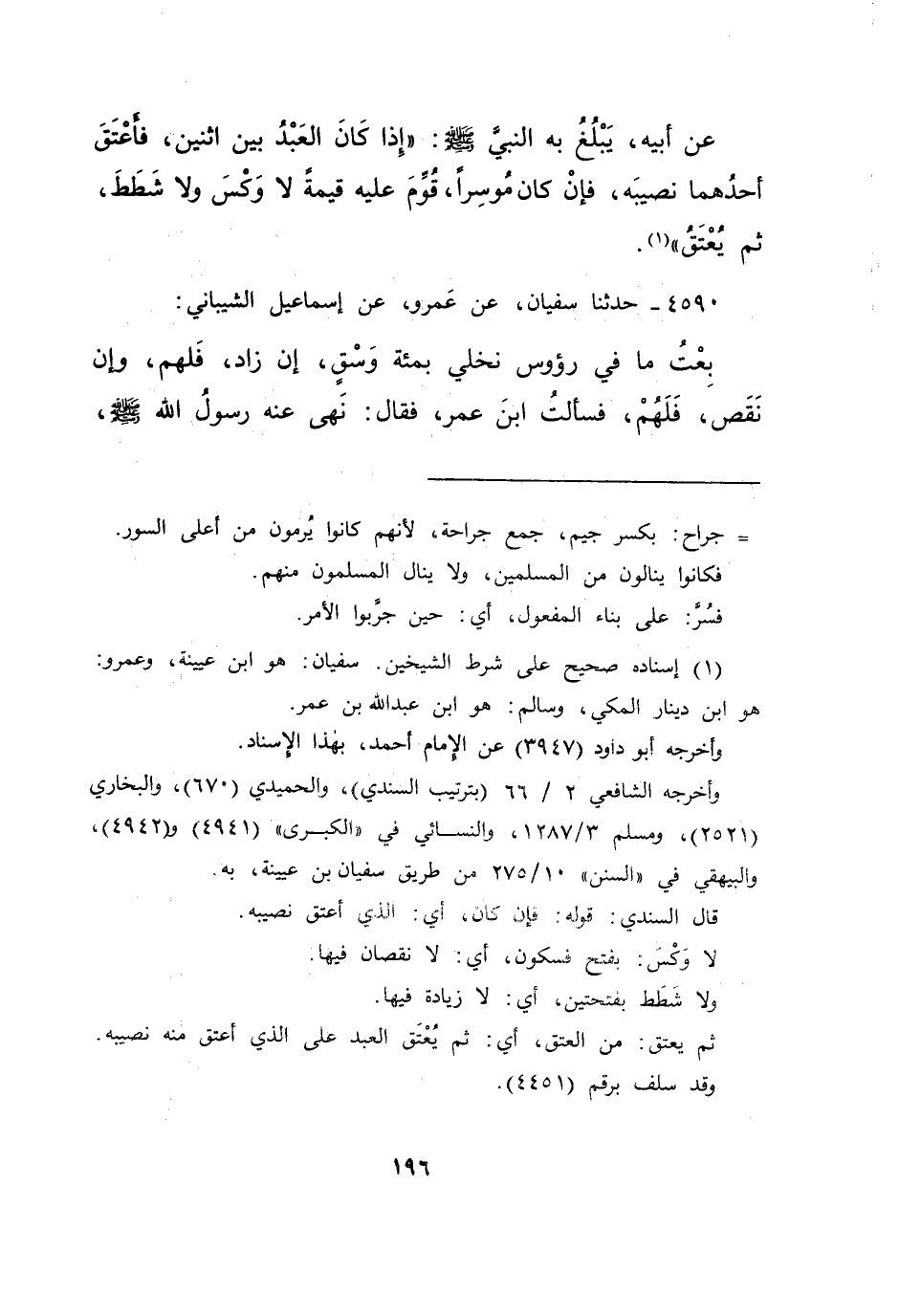 ٤٥٩٠ - حَدَّثَنَا سُفْيَانُ، عَنْ عَمْرٍو، عَنْ إِسْمَاعِيلَ الشَّيْبَانِيِّ، بِعْتُ مَا فِي رُءُوسِ نَخْلِي بِمِائَةِ وَسْقٍ، إِنْ زَادَ فَلَهُمْ، وَإِنْ نَقَصَ فَلَهُمْ، فَسَأَلْتُ ابْنَ عُمَرَ: فَقَالَ: " نَهَى عَنْهُ رَسُولُ اللهِ صَلَّى اللهُ عَلَيْهِ وَسَلَّمَ،