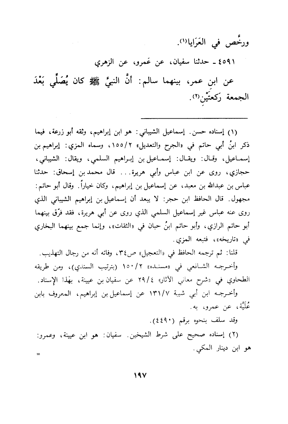 ٤٥٩١ - حَدَّثَنَا سُفْيَانُ، عَنْ عَمْرٍو، عَنِ الزُّهْرِيِّ، عَنِ ابْنِ عُمَرَ، بَيْنَهُمَا سَالِمٌ: " أَنَّ النَّبِيَّ صَلَّى اللهُ عَلَيْهِ وَسَلَّمَ كَانَ يُصَلِّي بَعْدَ الْجُمُعَةِ رَكْعَتَيْنِ " (٢)