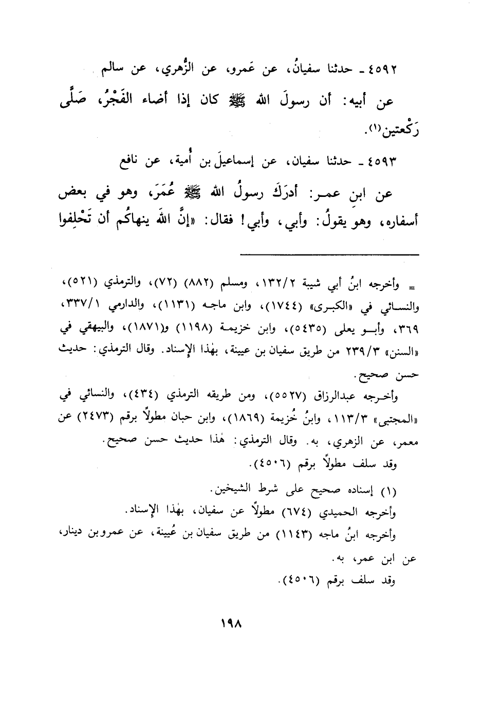 ٤٥٩٢ - حَدَّثَنَا سُفْيَانُ، عَنْ عَمْرٍو، عَنِ الزُّهْرِيِّ، عَنْ سَالِمٍ، عَنْ أَبِيهِ: " أَنَّ رَسُولَ اللهِ صَلَّى اللهُ عَلَيْهِ وَسَلَّمَ كَانَ إِذَا أَضَاءَ الْفَجْرُ، صَلَّى رَكْعَتَيْنِ " (١)