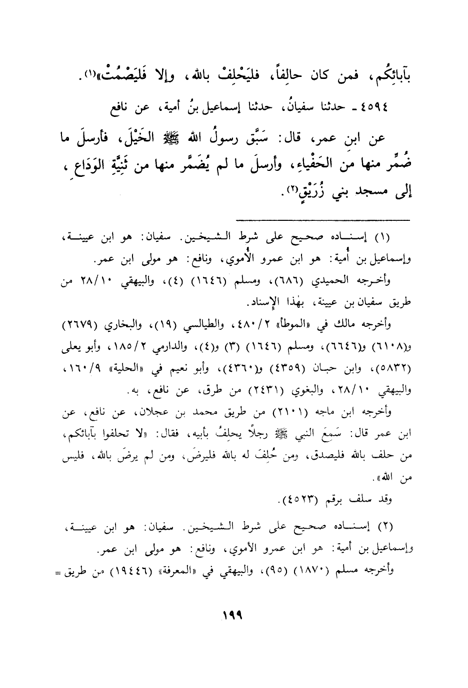 ٤٥٩٤ - حَدَّثَنَا سُفْيَانُ، حَدَّثَنَا إِسْمَاعِيلُ بْنُ أُمَيَّةَ، عَنْ نَافِعٍ، عَنِ ابْنِ عُمَرَ، قَالَ: " سَبَّقَ رَسُولُ اللهِ صَلَّى اللهُ عَلَيْهِ وَسَلَّمَ الْخَيْلَ، فَأَرْسَلَ مَا ضُمِّرَ مِنْهَا مِنَ الْحَفْيَاءِ، وَأَرْسَلَ مَا لَمْ يُضَمَّرْ مِنْهَا مِنْ ثَنِيَّةِ الْوَدَاعِ، إِلَى مَسْجِدِ بَنِي زُرَيْقٍ " (٢)