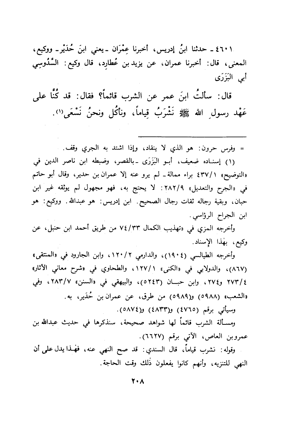٤٦٠١ - حَدَّثَنَا ابْنُ إِدْرِيسَ، أَخْبَرَنَا عِمْرَانُ يَعْنِي ابْنَ حُدَيْرٍ، وَوَكِيعٌ الْمَعْنَى قَالَ: أَخْبَرَنَا عِمْرَانُ، عَنْ يَزِيدَ بْنِ عُطَارِدٍ، قَالَ: وَكِيعٌ السَّدُوسِيِّ أَبِي الْبَزَرِيِّ قَالَ: سَأَلْتُ ابْنَ عُمَرَ عَنِ الشُّرْبِ قَائِمًا؟ فَقَالَ: قَدْ " كُنَّا عَلَى عَهْدِ رَسُولِ اللهِ صَلَّى اللهُ عَلَيْهِ وَسَلَّمَ، نَشْرَبُ قِيَامًا، وَنَأْكُلُ وَنَحْنُ نَسْعَى " (١)