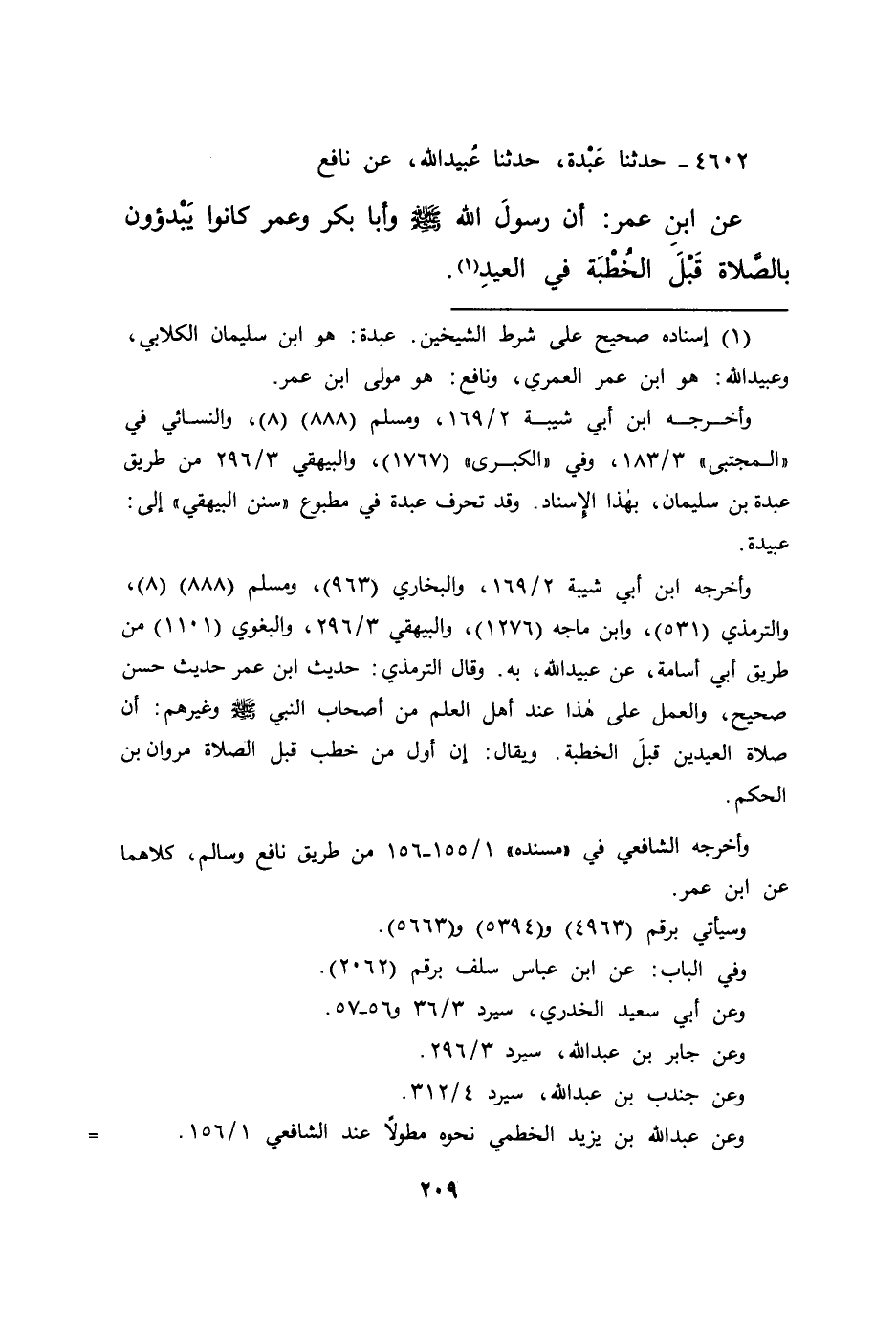 وأخرجه ابن أبي شيبة ٢/١٦٩، والبخاري (٩٦٣) ، ومسلم (٨٨٨) (٨) ، والترمذي (٥٣١) ، وابن ماجه (١٢٧٦) ، والبيهقي ٣/٢٩٦، والبغوي (١١٠١) من طريق أبي أسامة، عن عبيد الله، به. وقال الترمذي: حديث ابن عمر حديث حسن صحيح، والعمل على هذا عند أهل العلم من أصحاب النبي صَلَّى اللهُ عَلَيْهِ وَسَلَّمَ وغيرهم: أن صلاة العيدين قبل الخطبة. ويقال: إن أول من خطب قبل الصلاة مروان بن الحكم.