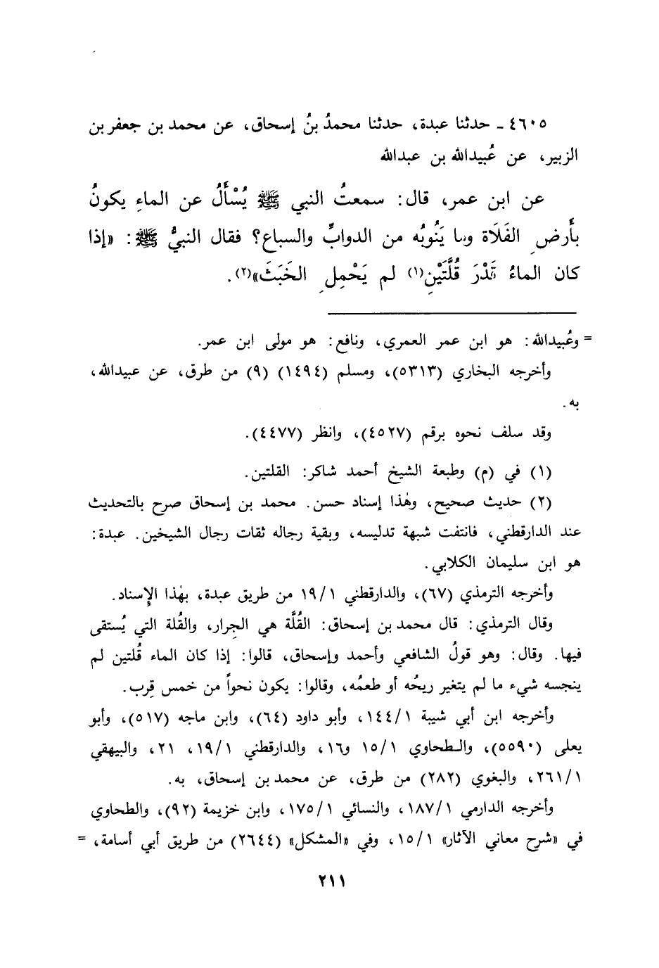 ٤٦٠٥ - حَدَّثَنَا عَبْدَةُ، حَدَّثَنَا مُحَمَّدُ بْنُ إِسْحَاقَ، عَنْ مُحَمَّدِ بْنِ جَعْفَرِ بْنِ الزُّبَيْرِ، عَنْ عُبَيْدِ اللهِ بْنِ عَبْدِ اللهِ، عَنِ ابْنِ عُمَرَ، قَالَ: سَمِعْتُ النَّبِيَّ صَلَّى اللهُ عَلَيْهِ وَسَلَّمَ، يُسْأَلُ عَنِ الْمَاءِ يَكُونُ بِأَرْضِ الْفَلَاةِ، وَمَا يَنُوبُهُ مِنَ الدَّوَابِّ، وَالسِّبَاعِ؟ فَقَالَ النَّبِيُّ صَلَّى اللهُ عَلَيْهِ وَسَلَّمَ: " إِذَا كَانَ الْمَاءُ قَدْرَ قُلَّتَيْنِ (١) لَمْ يَحْمِلِ الْخَبَثَ " (٢)