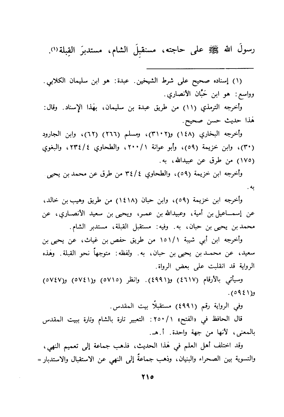 رَسُولَ اللهِ صَلَّى اللهُ عَلَيْهِ وَسَلَّمَ عَلَى حَاجَتِهِ مُسْتَقْبِلَ الشَّامِ مُسْتَدْبِرَ الْقِبْلَةِ " (١)